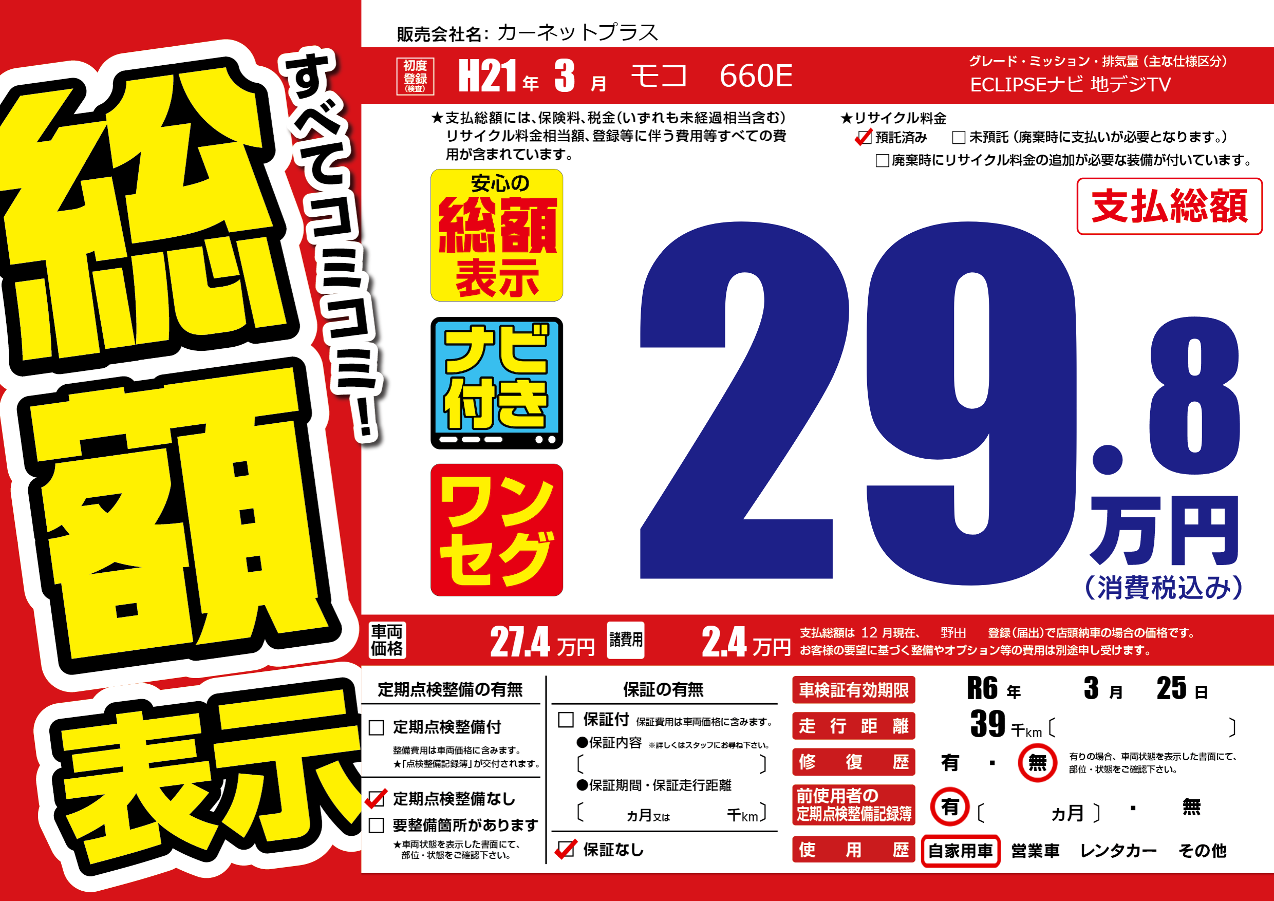 | 走行キロ | 3.9万km | 初年度登録 | H21年3月 |