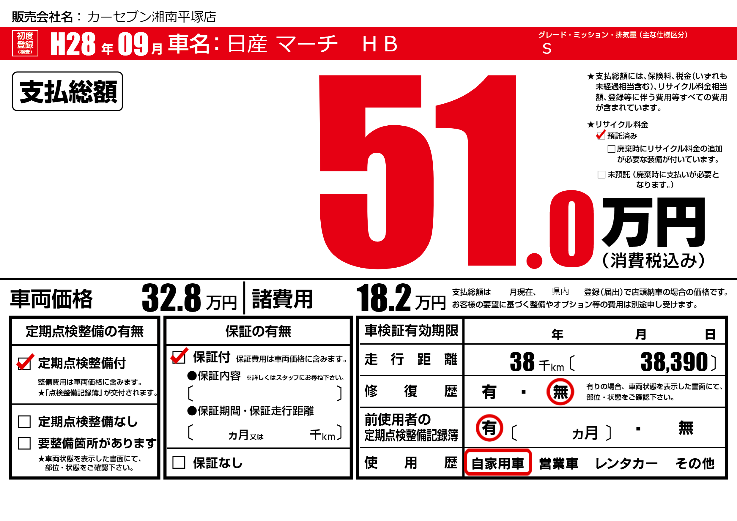 | 車名 | 日産 マーチ HB | グレード ミッション 排気量 |