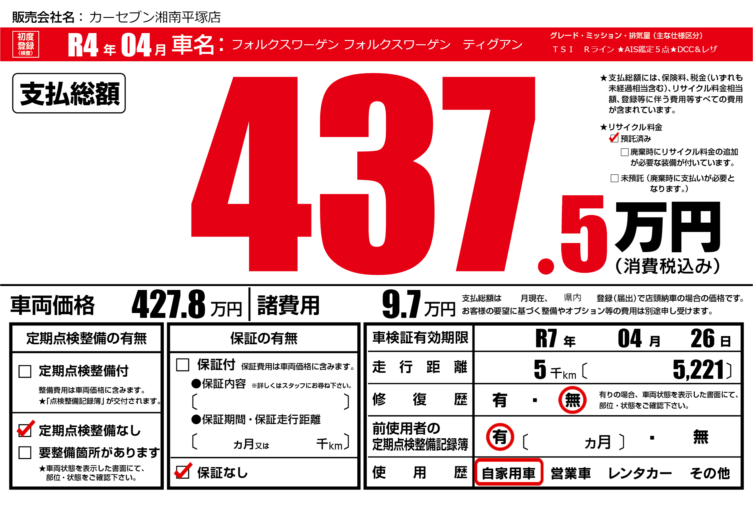 | 走行キロ | 0.5万km | 初年度登録 | R4年04月 |