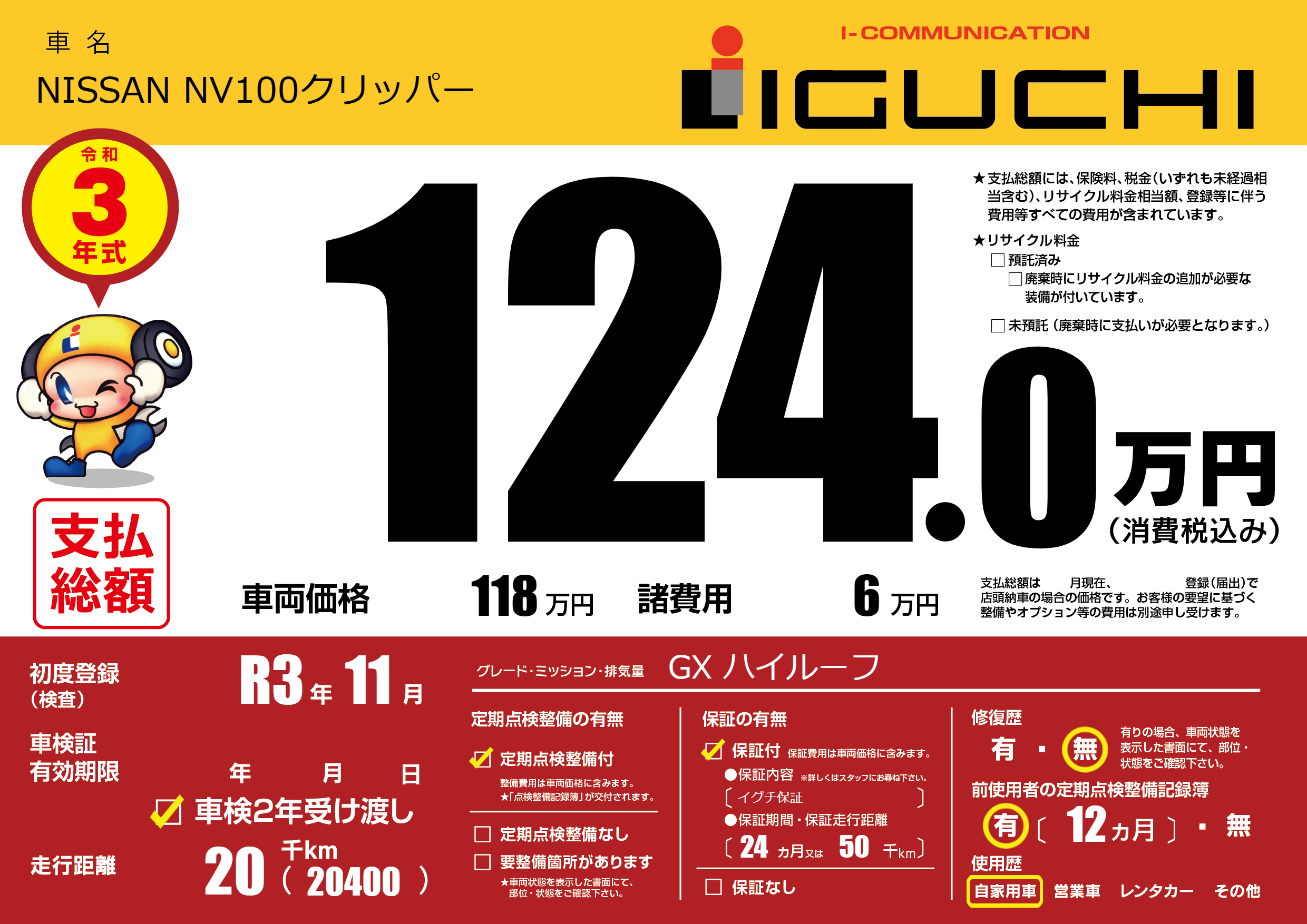 保証付き 保証内容(イグチ保証) 24ヶ月または(50)千kmまで |