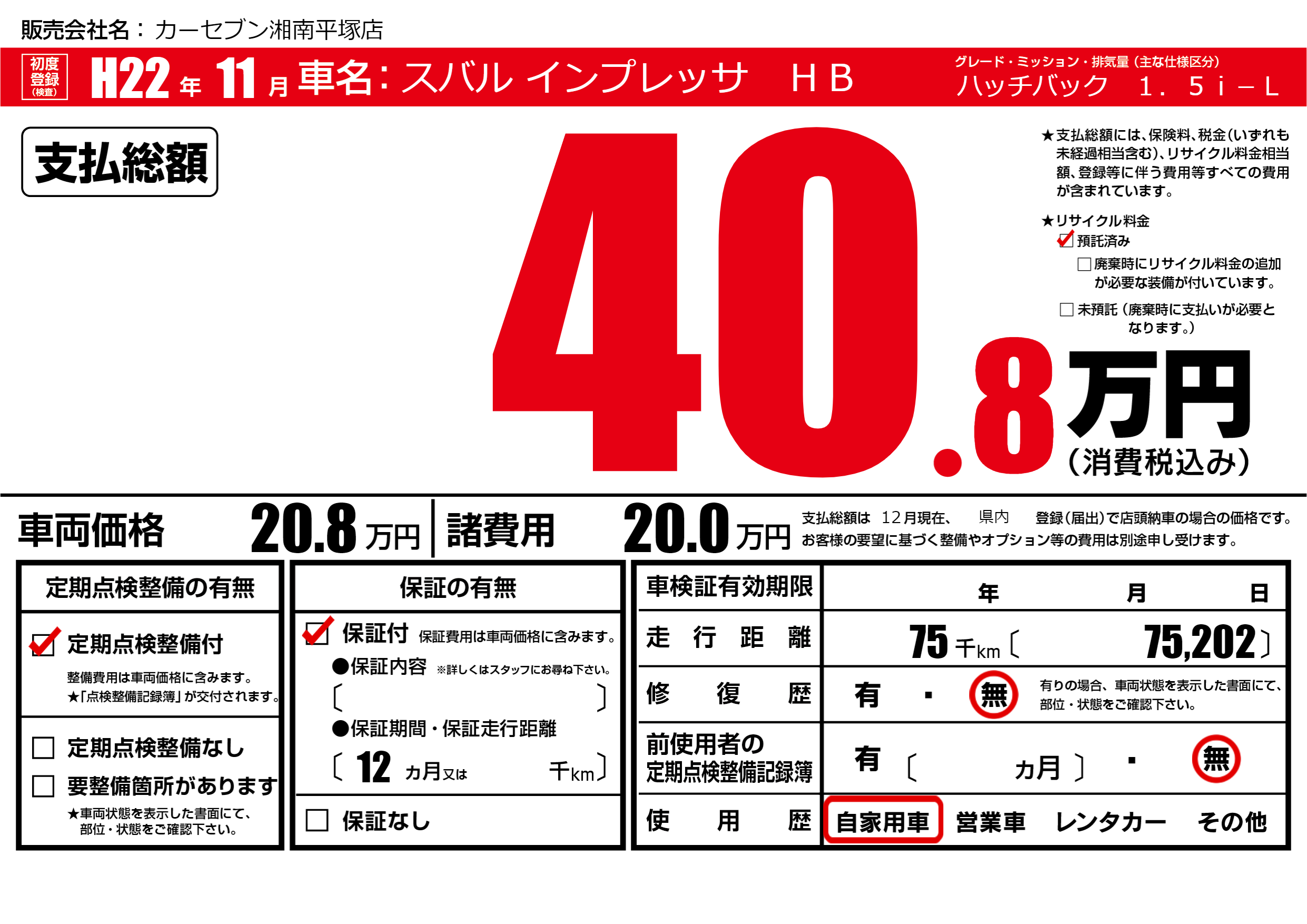 | 車名 | スバル インプレッサ HB | グレード ミッション 排気量 |