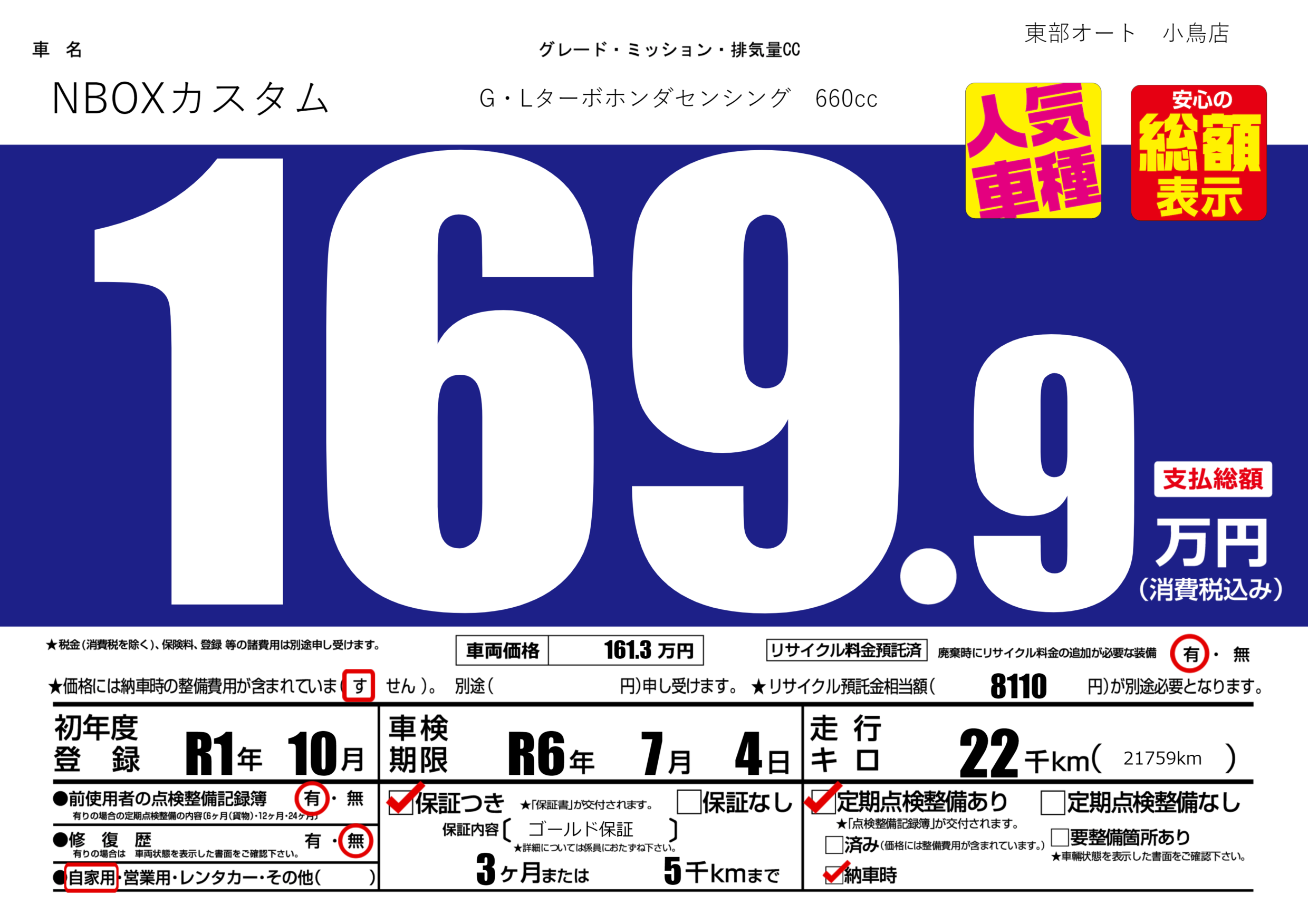 保証付き 保証内容( ゴールド保証) 3ヶ月または5千km |