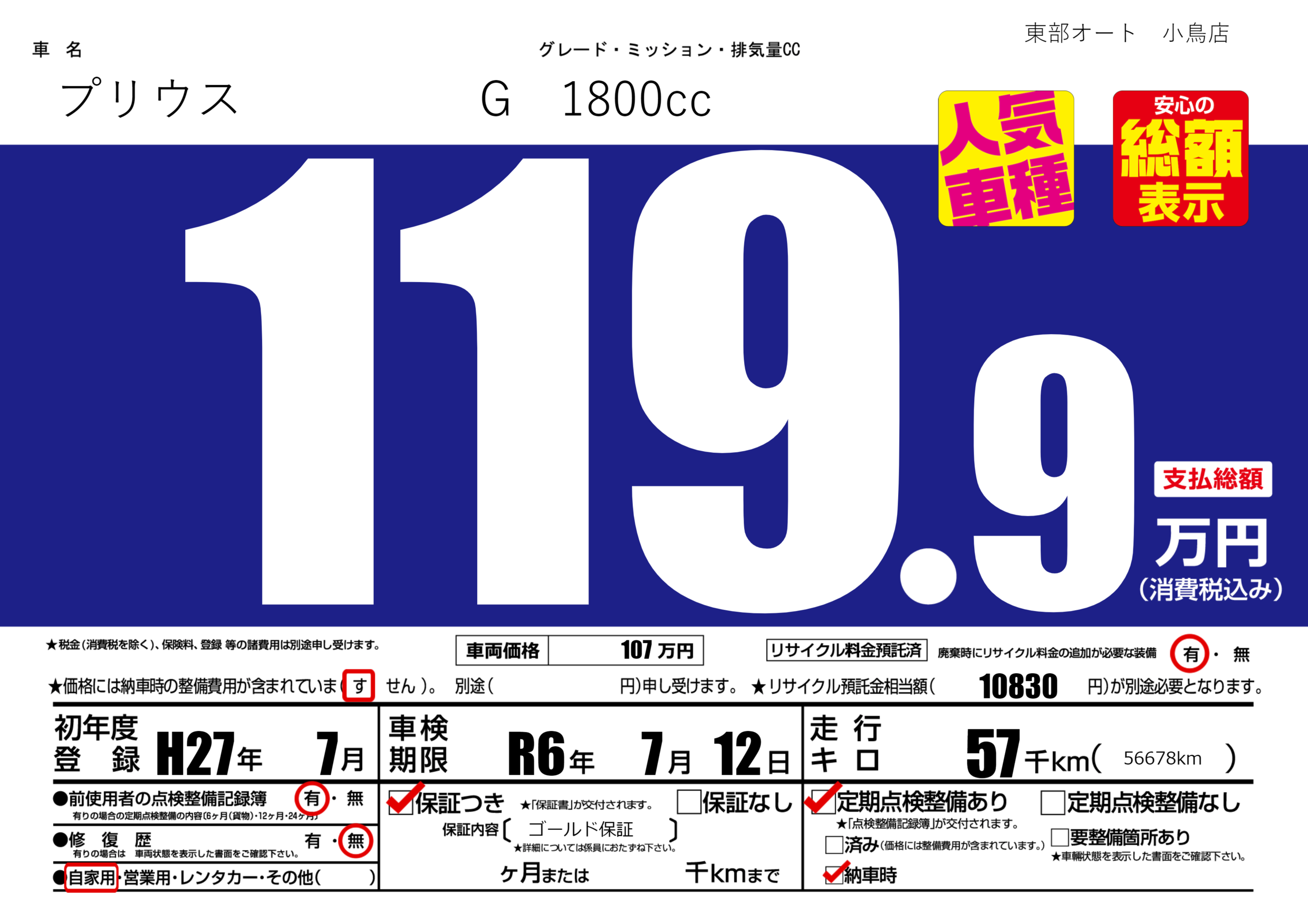 | 車名 | プリウス | グレード ミッション 排気量 |