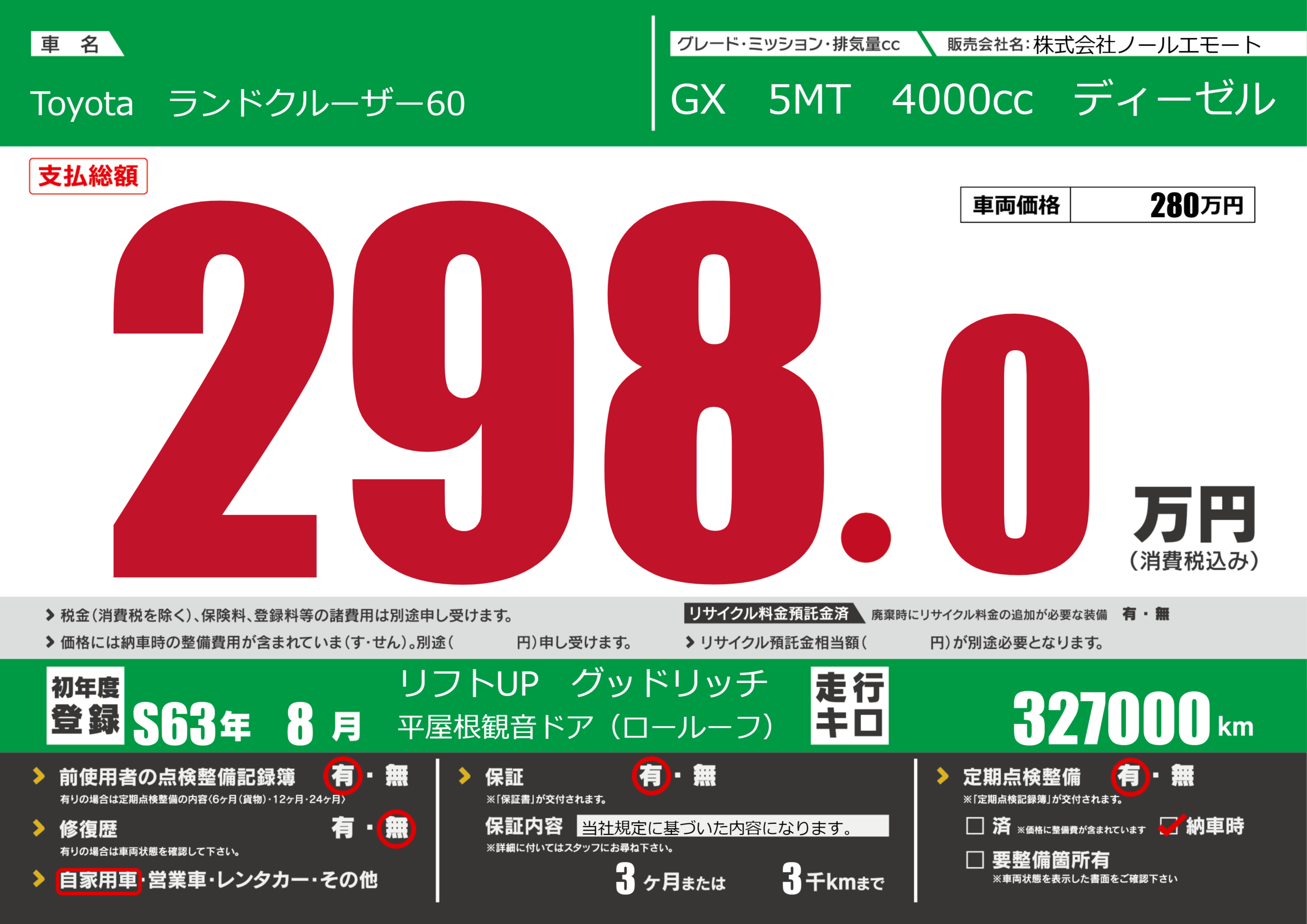 | 走行キロ | 32700万km | 初年度登録 | S63年8月 |