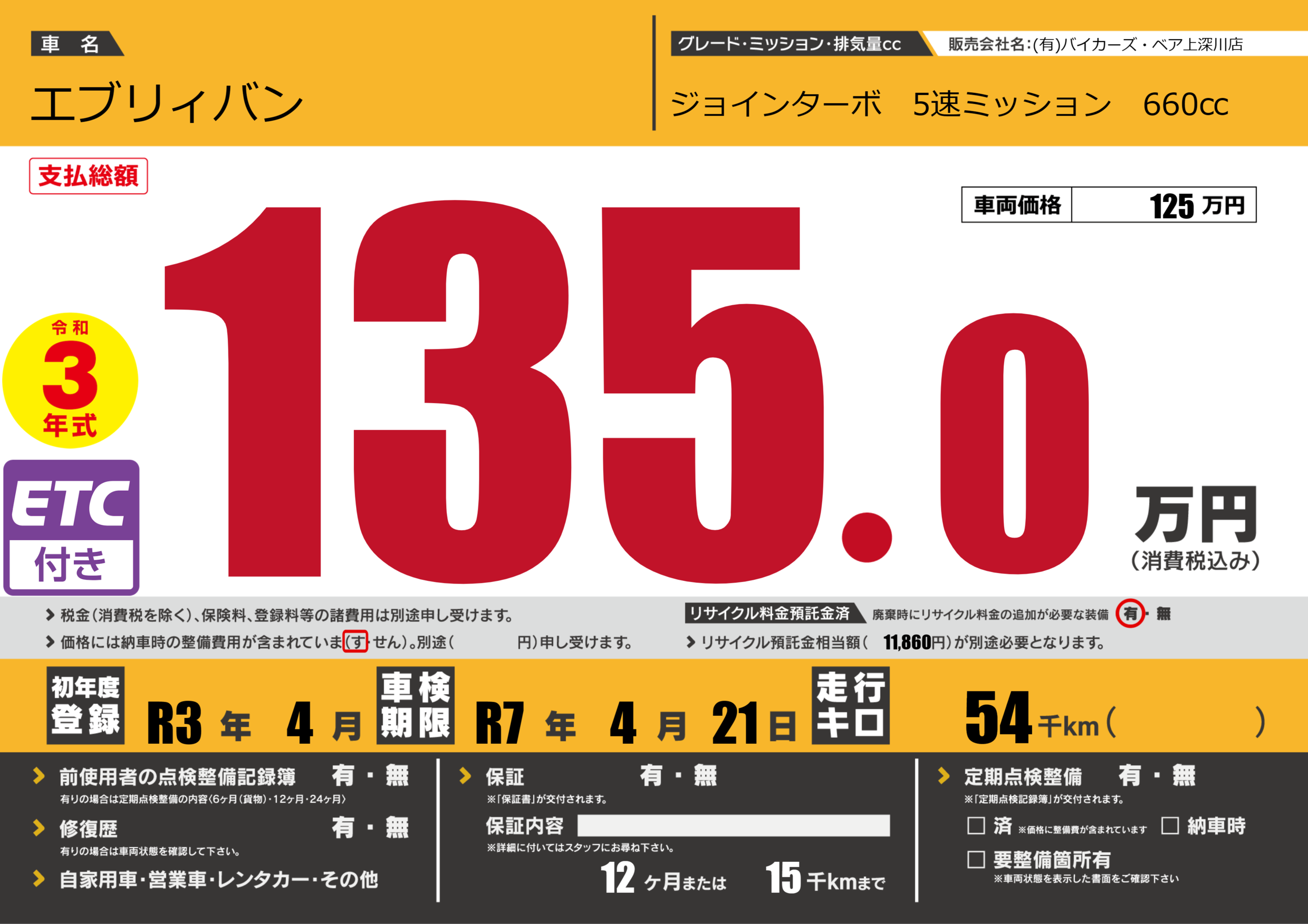 | 車名 | エブリィバン | グレード ミッション 排気量 |