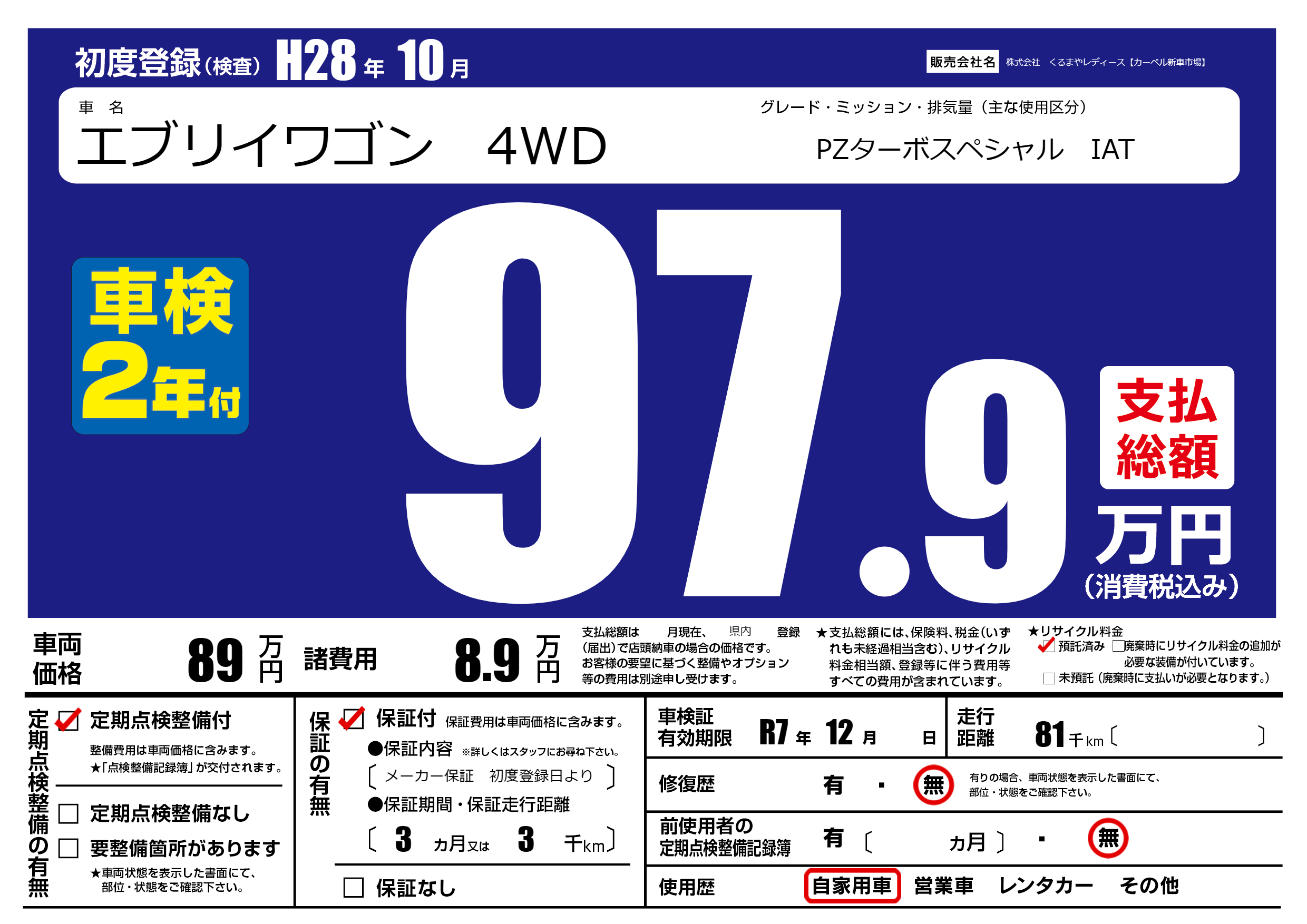 | 車名 | エブリイワゴン 4WD | グレード ミッション 排気量 |