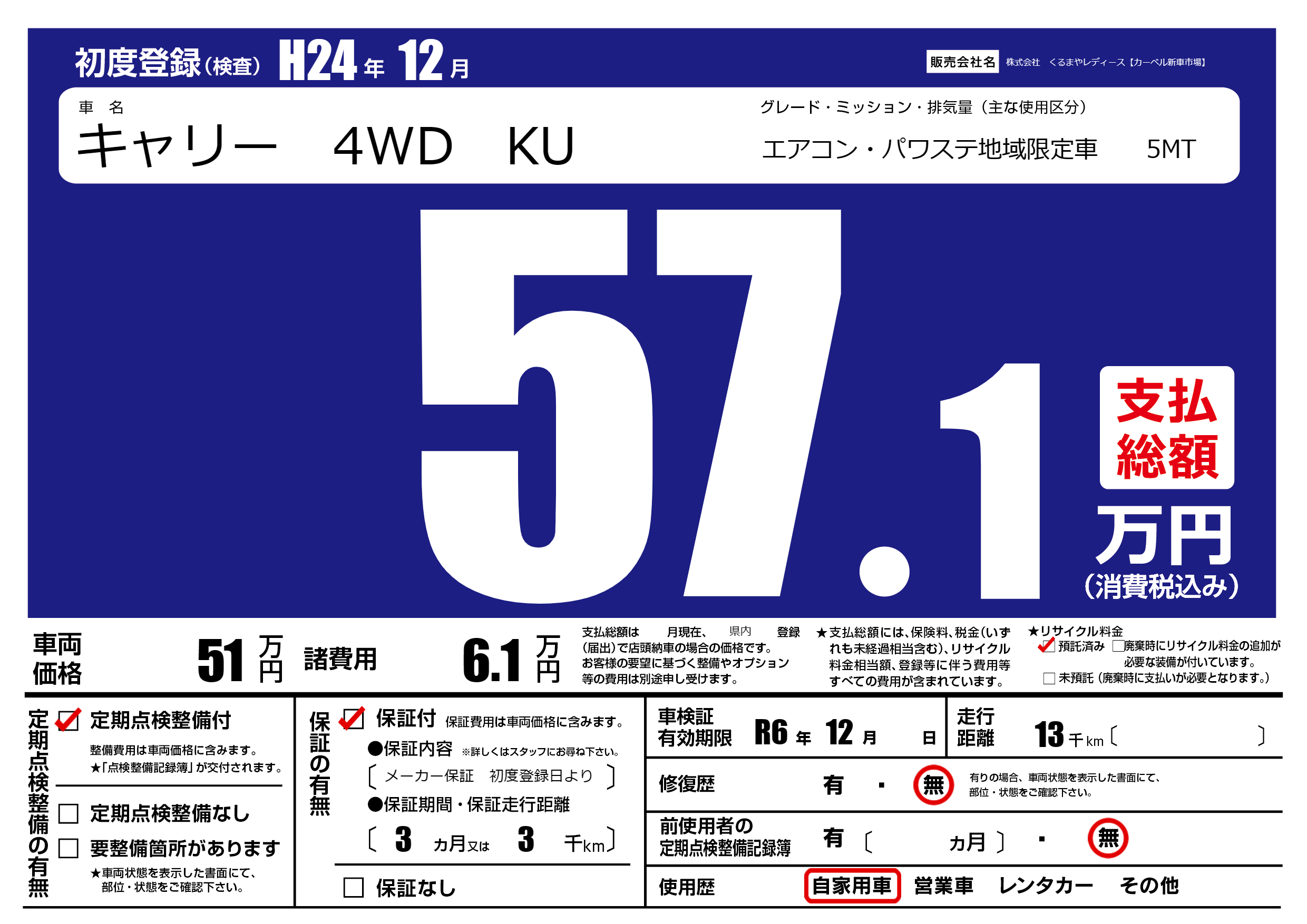 | 走行キロ | 1.3万km | 初年度登録 | H24年12月 |