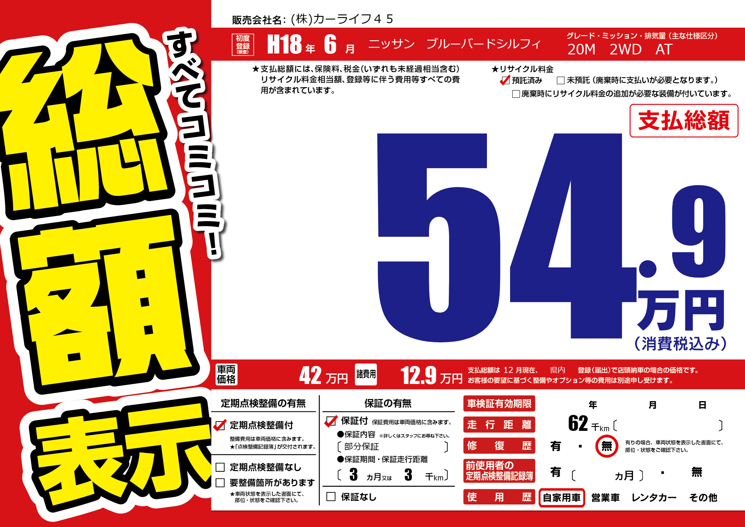 | 車名 | ニッサン ブルーバードシルフィ | グレード ミッション 排気量 |