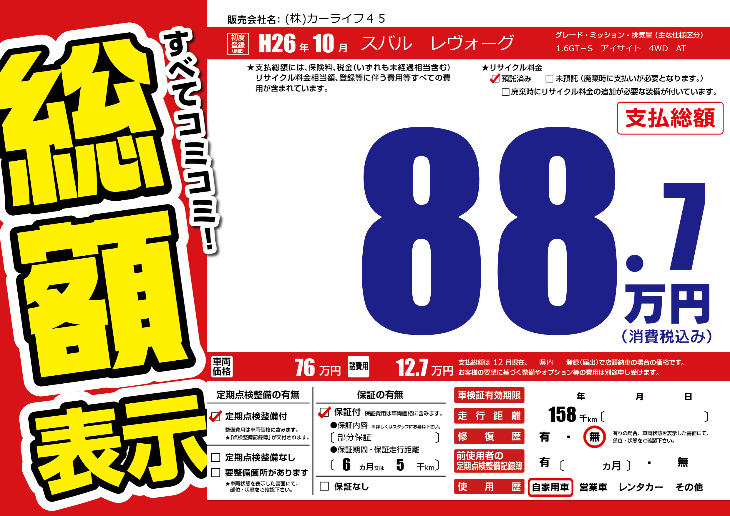 | 車名 | スバル レヴォーグ | グレード ミッション 排気量 |