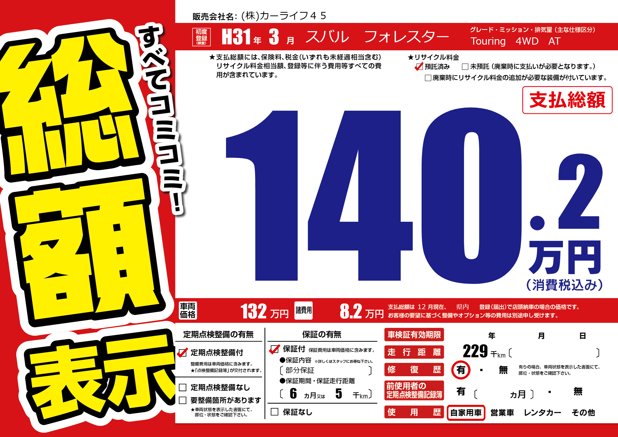 | 車名 | スバル フォレスター | グレード ミッション 排気量 |