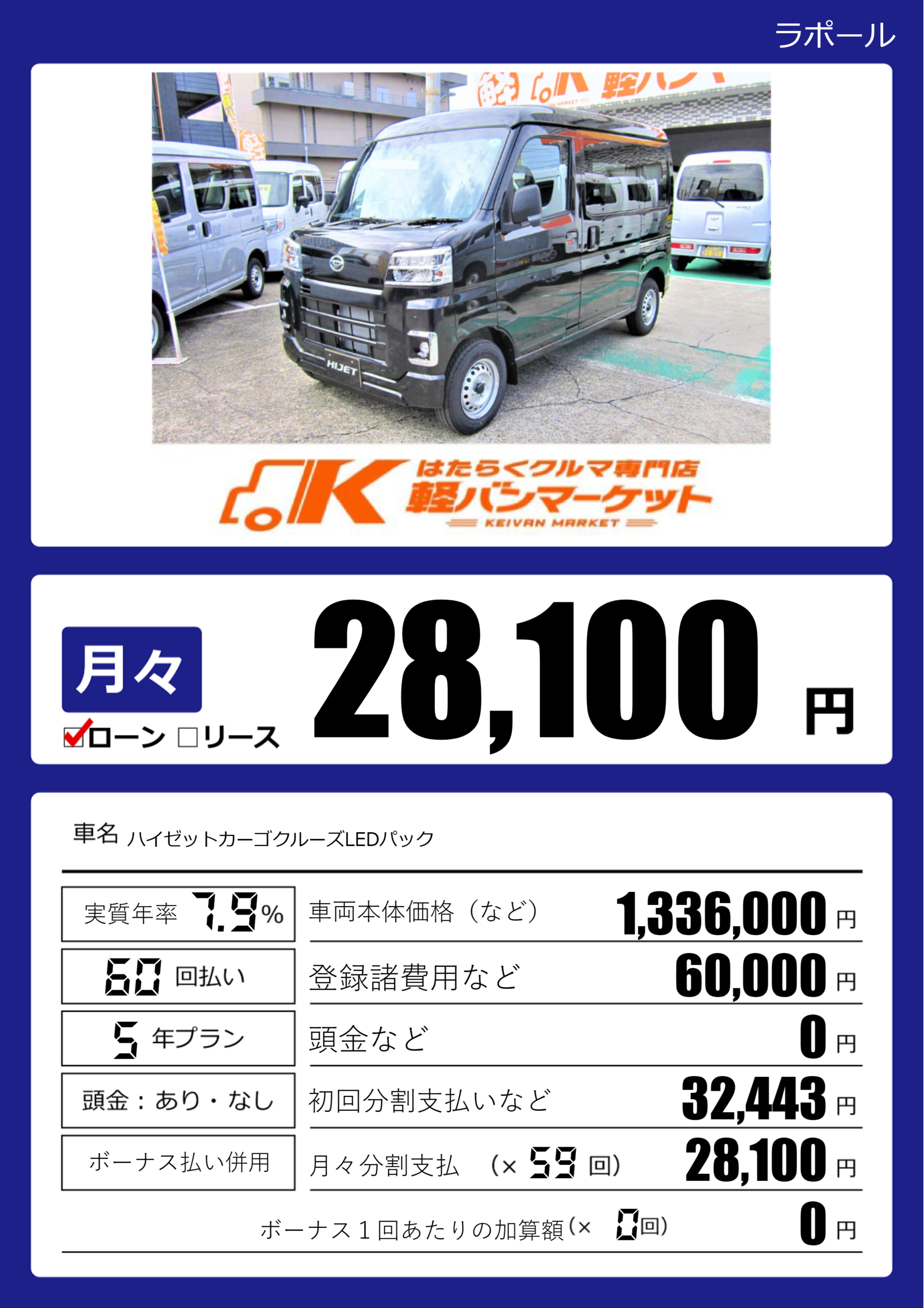 | 車名 | ハイゼットカーゴクルーズLEDパック | グレード ミッション 排気量 |