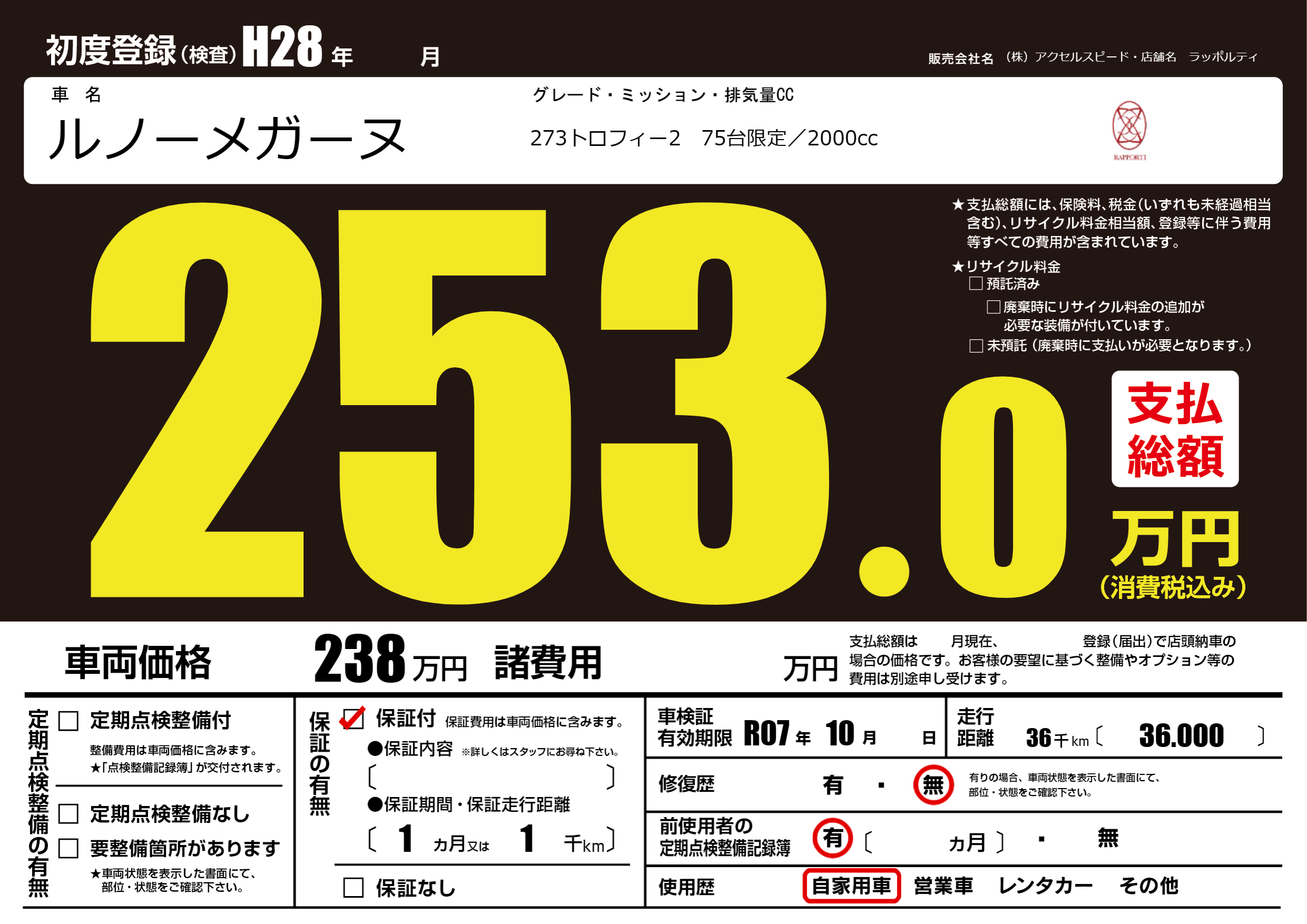 | 車名 | ルノーメガーヌ | グレード ミッション 排気量 |