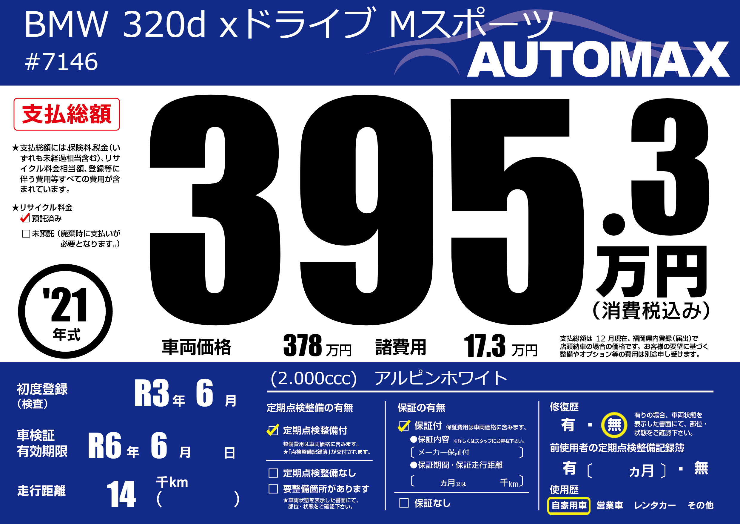 | 車名 | BMW 320d xドライブ Mスポーツ | グレード ミッション 排気量 |