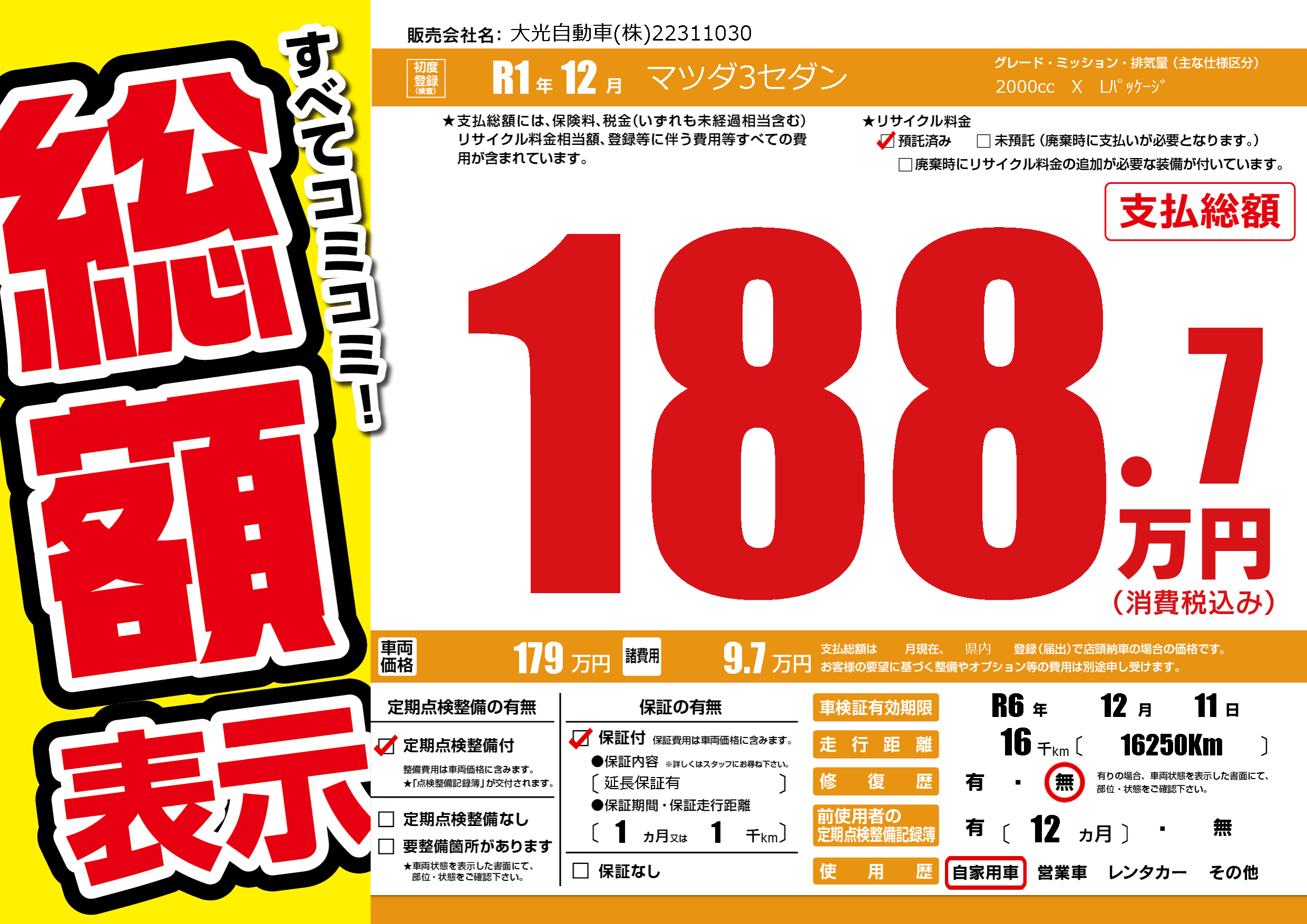 | 車名 | マツダ3セダン | グレード ミッション 排気量 |