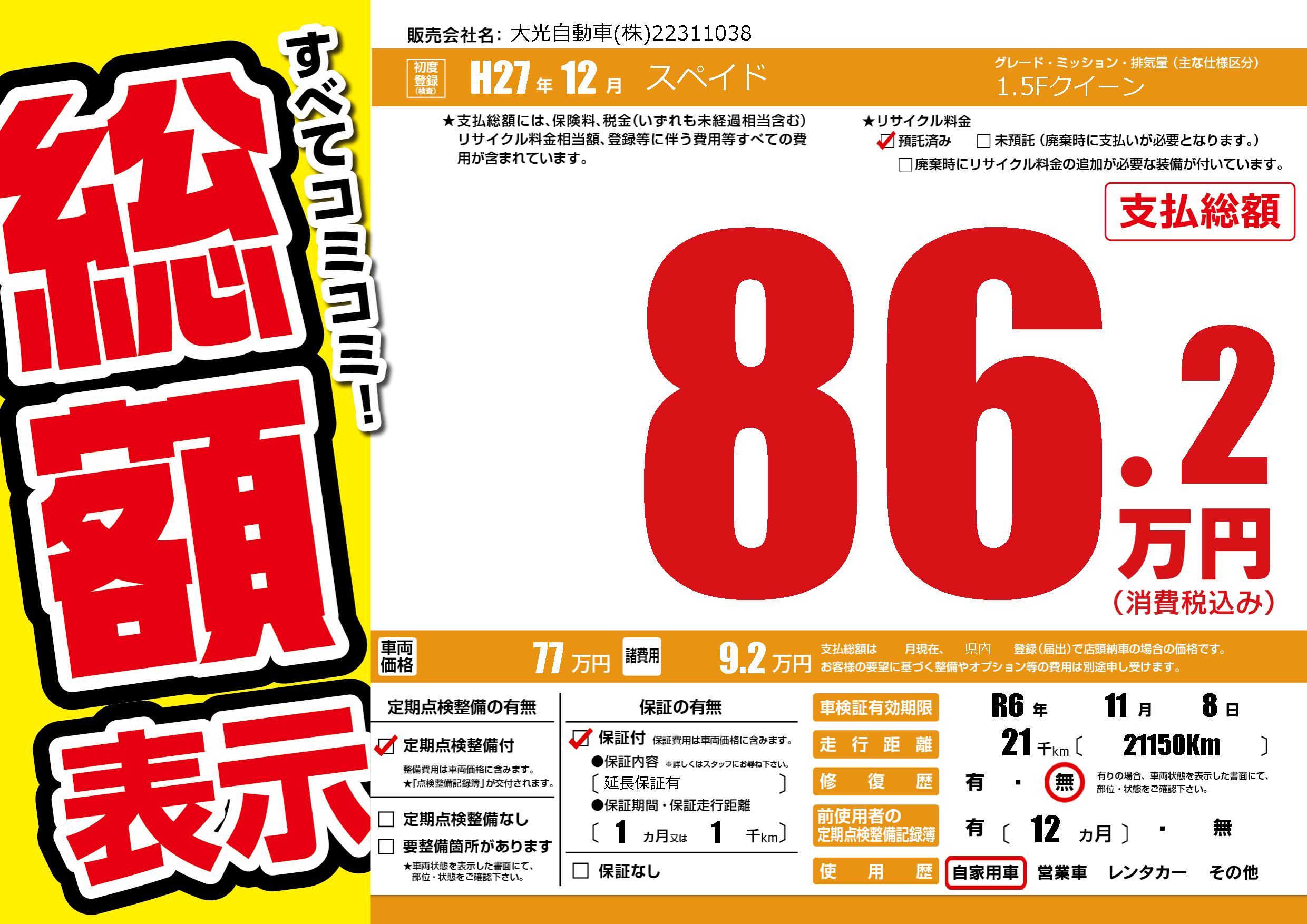 | 車検制限 | R6年 11月 8日 | ||