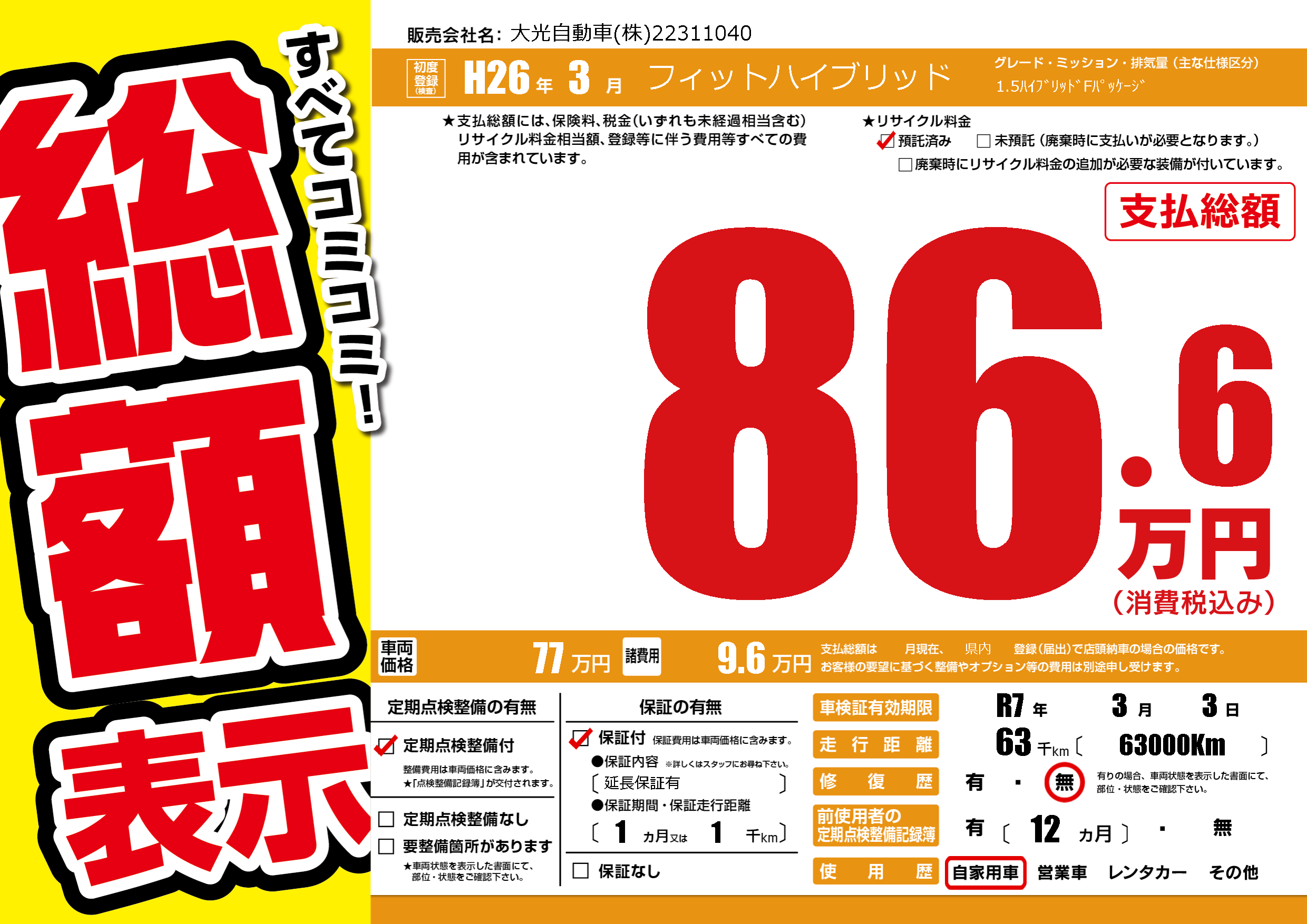 | 走行キロ | 6.3万km | 初年度登録 | H26年3月 |