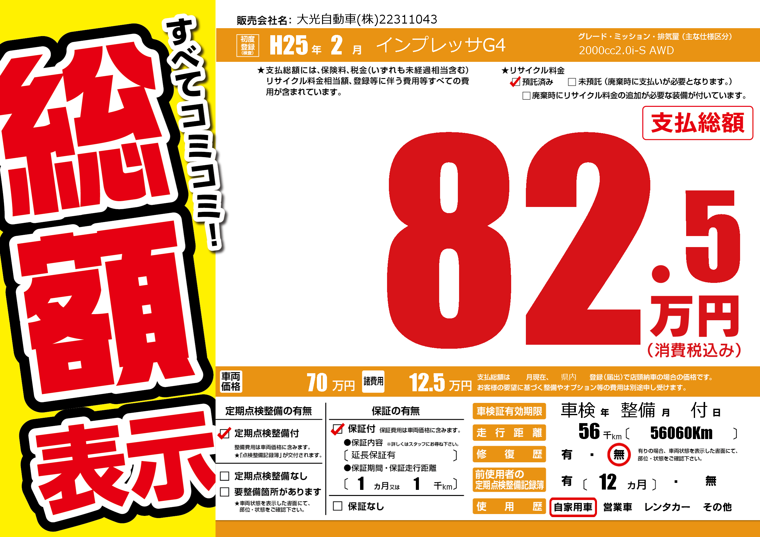 | 車名 | インプレッサG4 | グレード ミッション 排気量 |