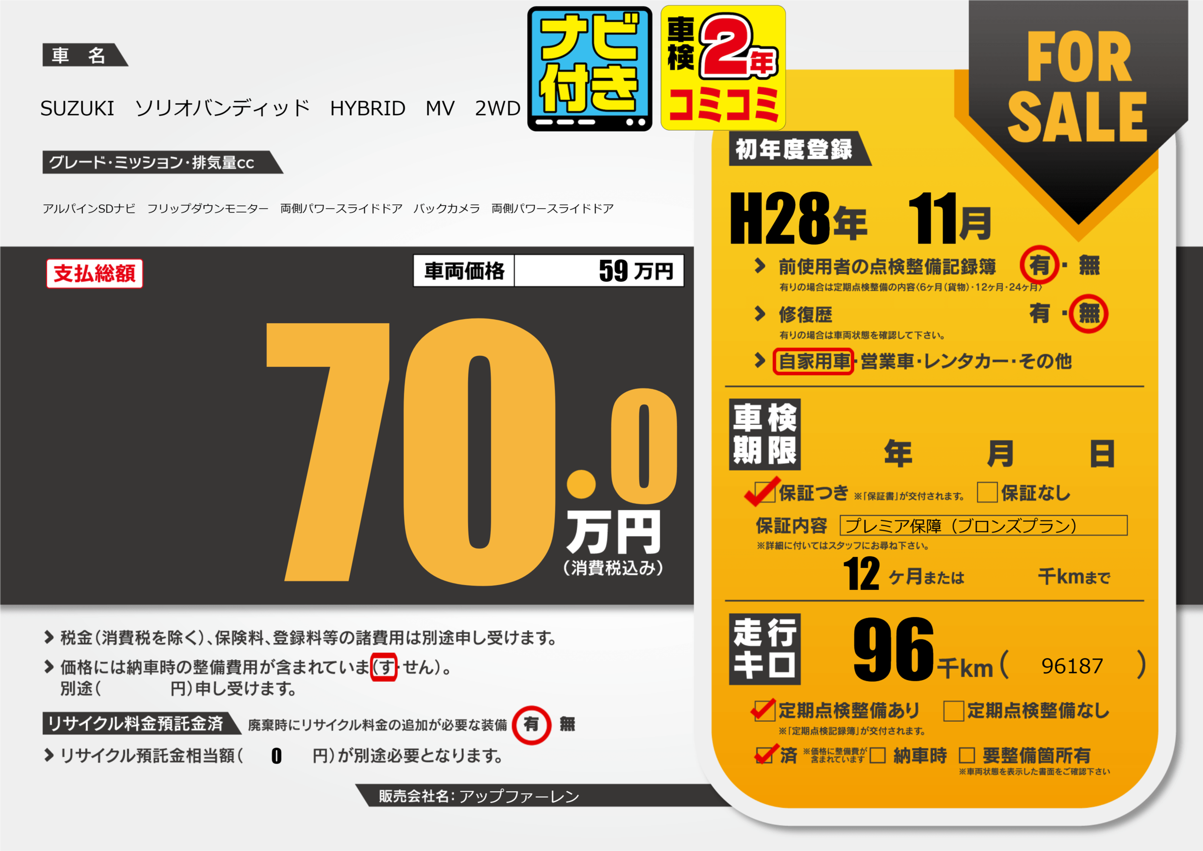 | 定期点検整備 | 定期点検整備あり 定期点検整備済み | ||
