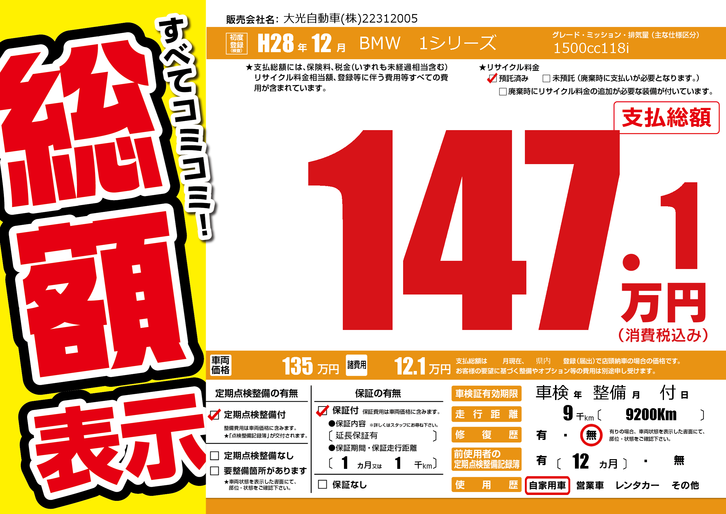 | 車名 | BMW 1シリーズ | グレード ミッション 排気量 |