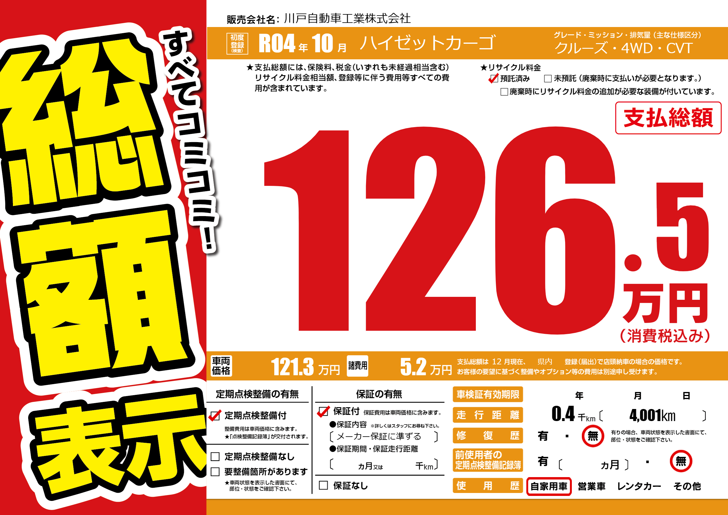 保証付き 保証内容(メーカー保証に準ずる) ---ヶ月または()千kmまで |