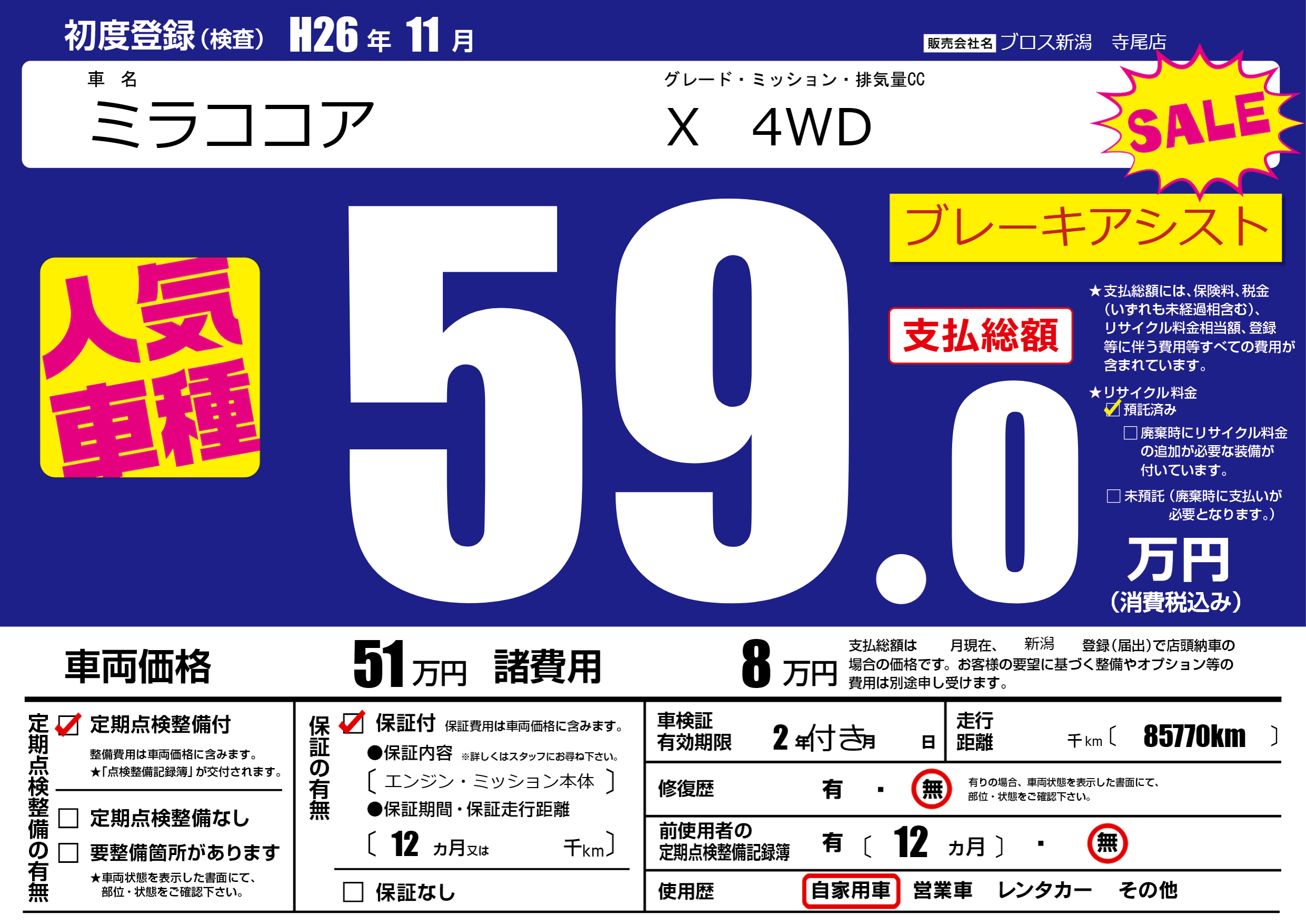 | 車名 | ミラココア | グレード ミッション 排気量 |
