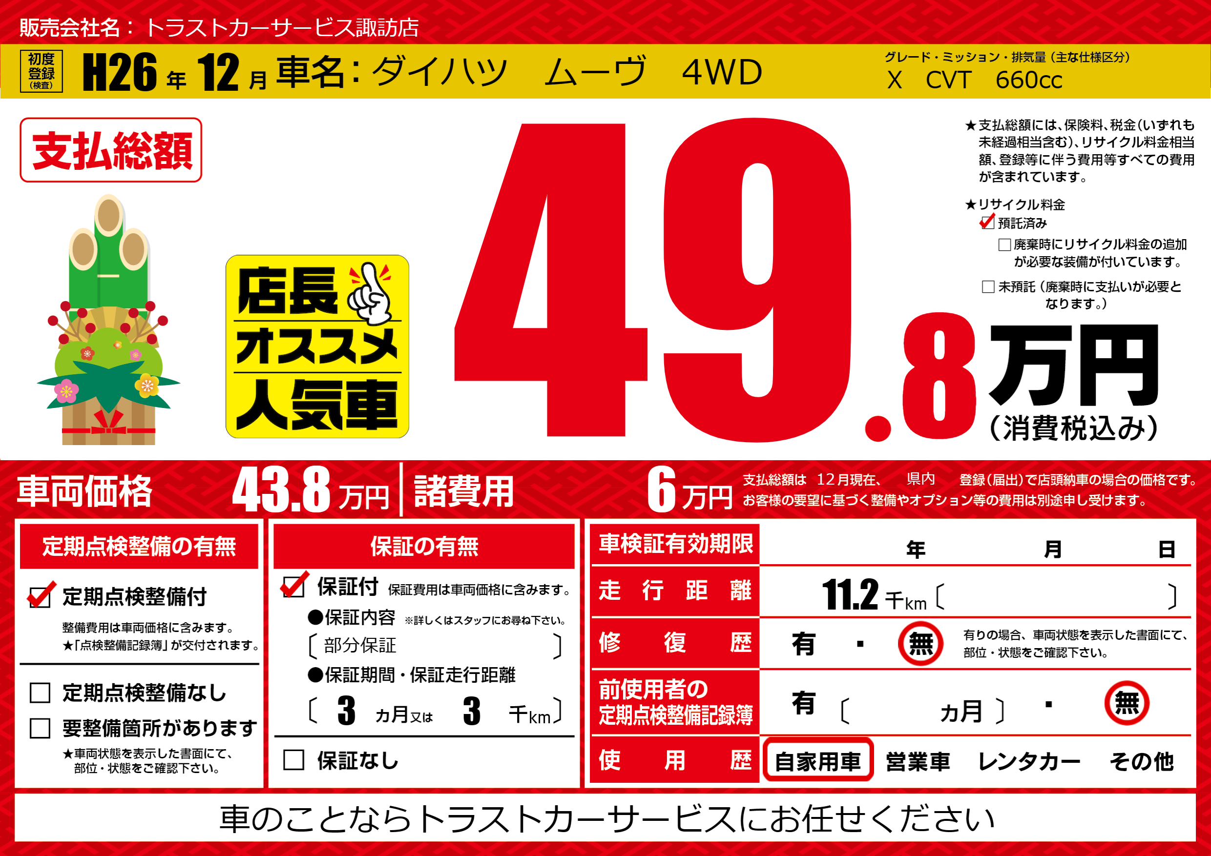 | 車名 | ダイハツ ムーヴ 4WD | グレード ミッション 排気量 |