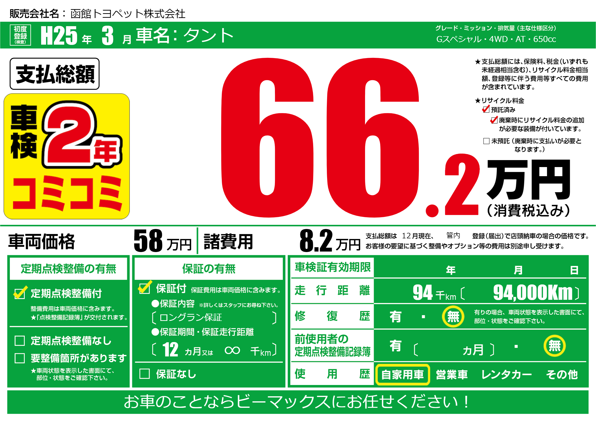 | 走行キロ | 9.4万km | 初年度登録 | H25年3月 |