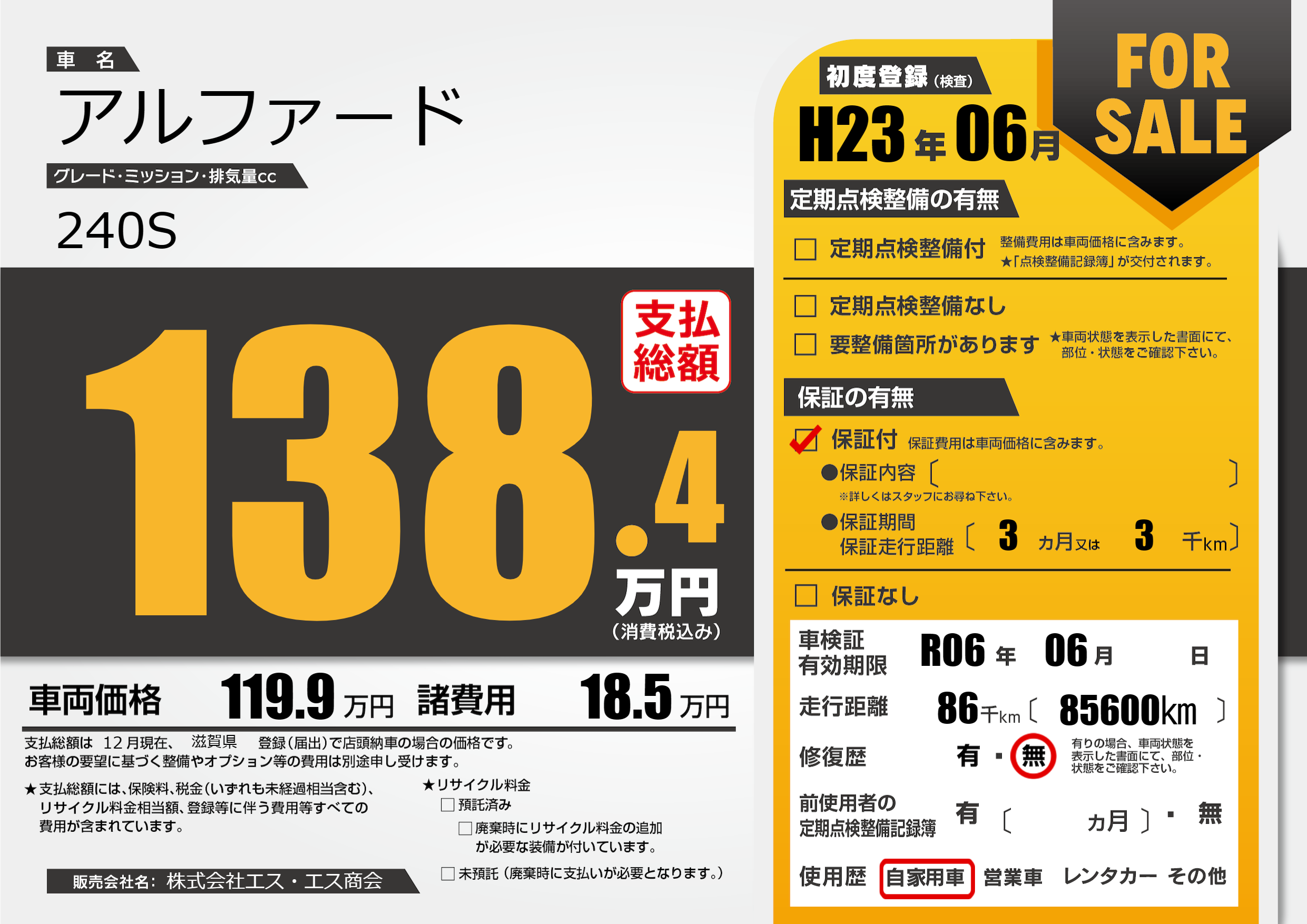 | 走行キロ | 8.6万km | 初年度登録 | H23年06月 |