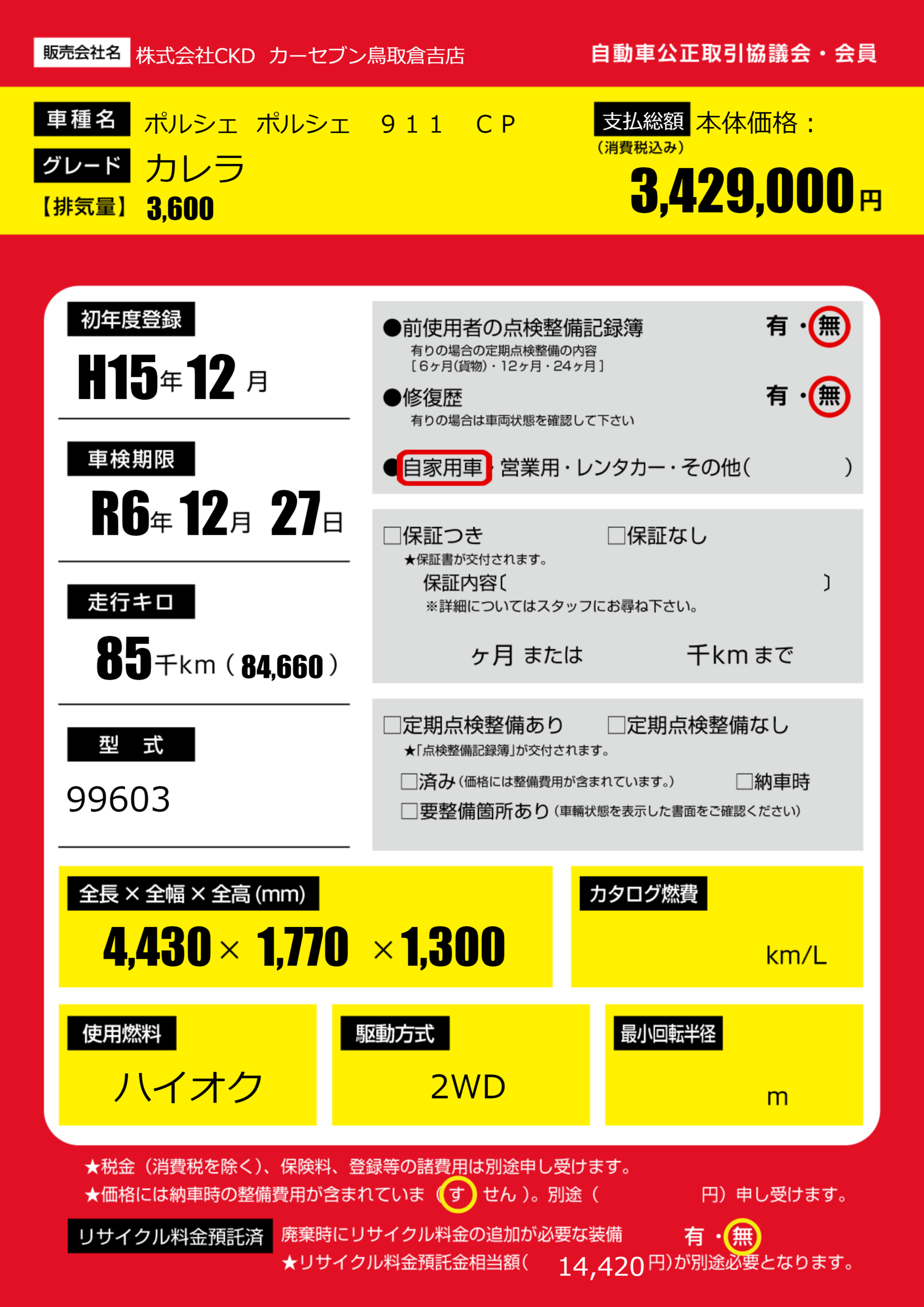 | 車名 | ポルシェ ポルシェ 911 CP | グレード ミッション 排気量 |