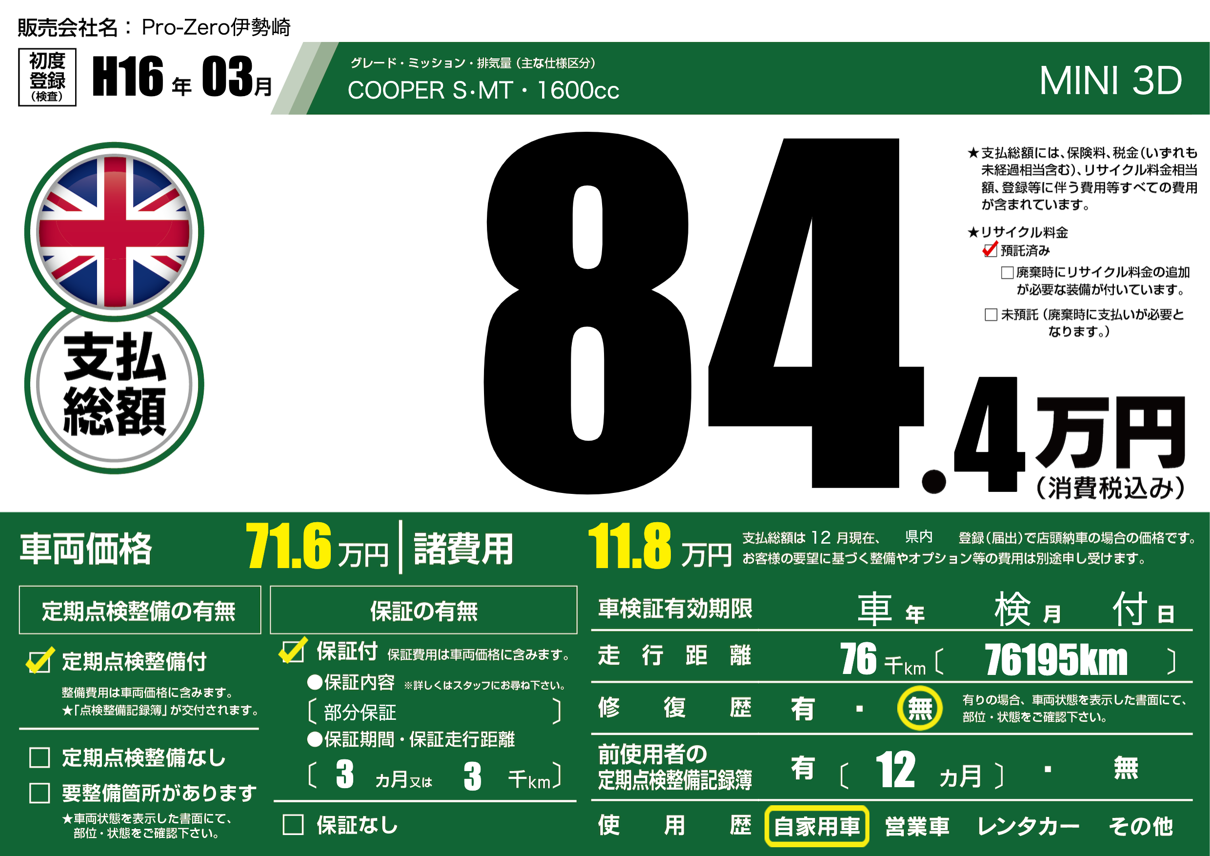 | 車名 | MINI 3D | グレード ミッション 排気量 |