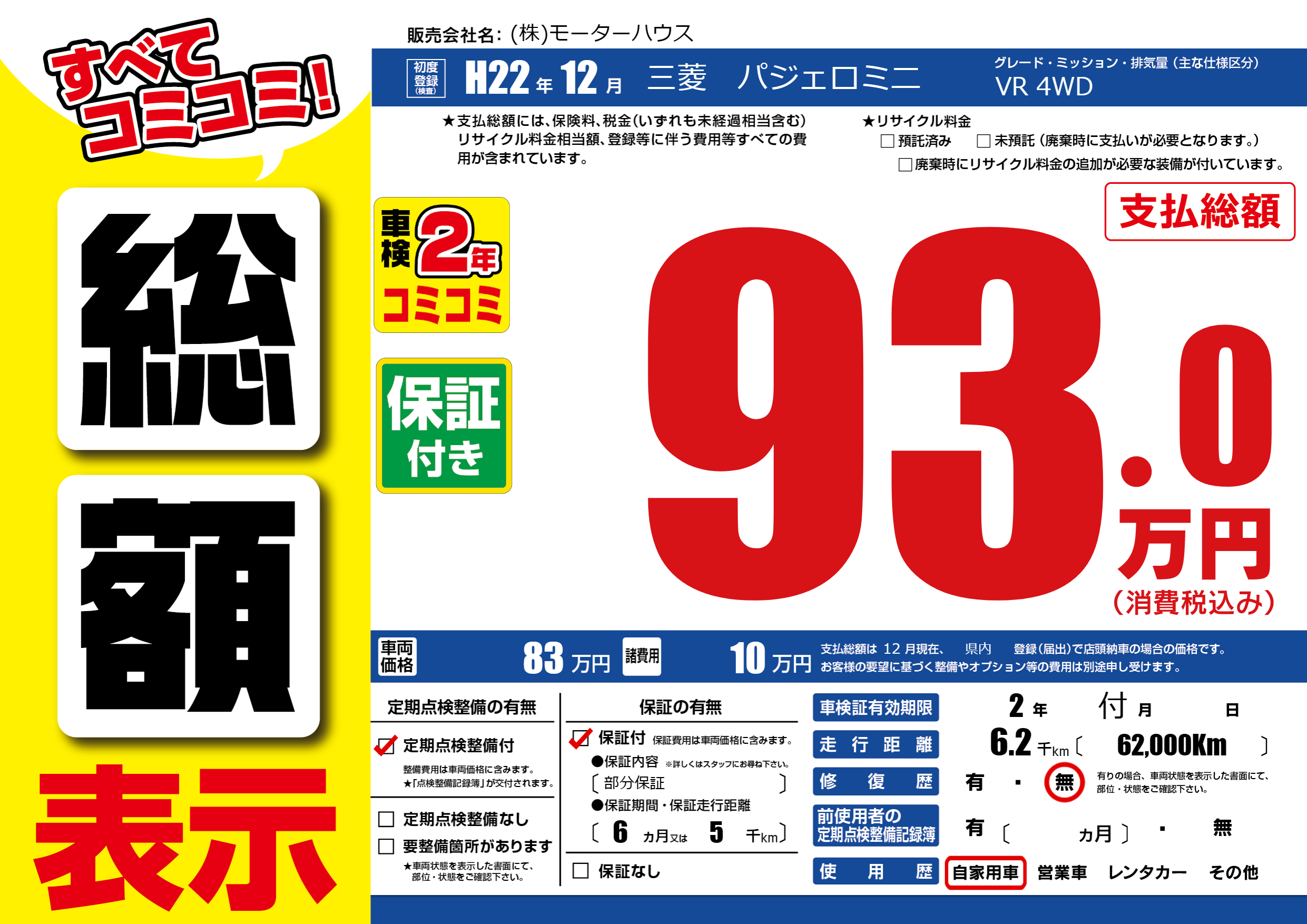 | 車名 | 三菱 パジェロミニ | グレード ミッション 排気量 |
