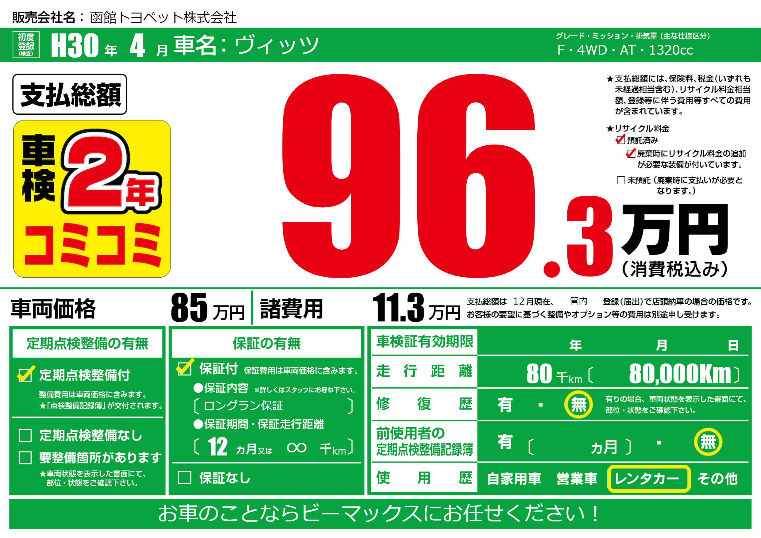 | 車名 | ヴィッツ | グレード ミッション 排気量 |