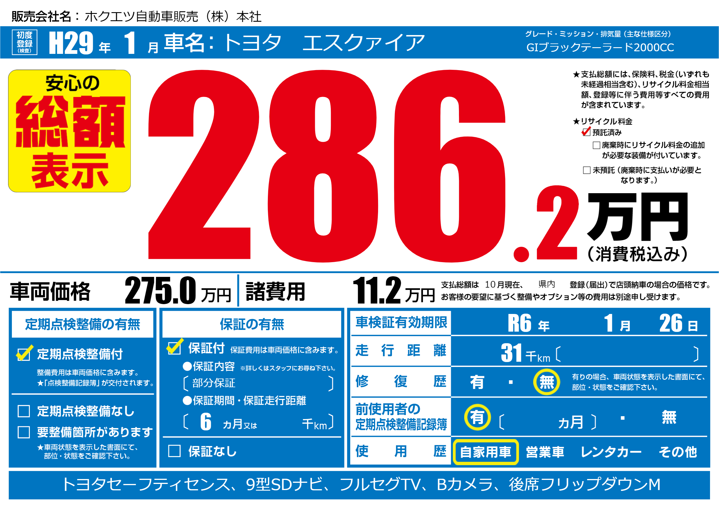 | 車名 | トヨタ エスクァイア | グレード ミッション 排気量 |