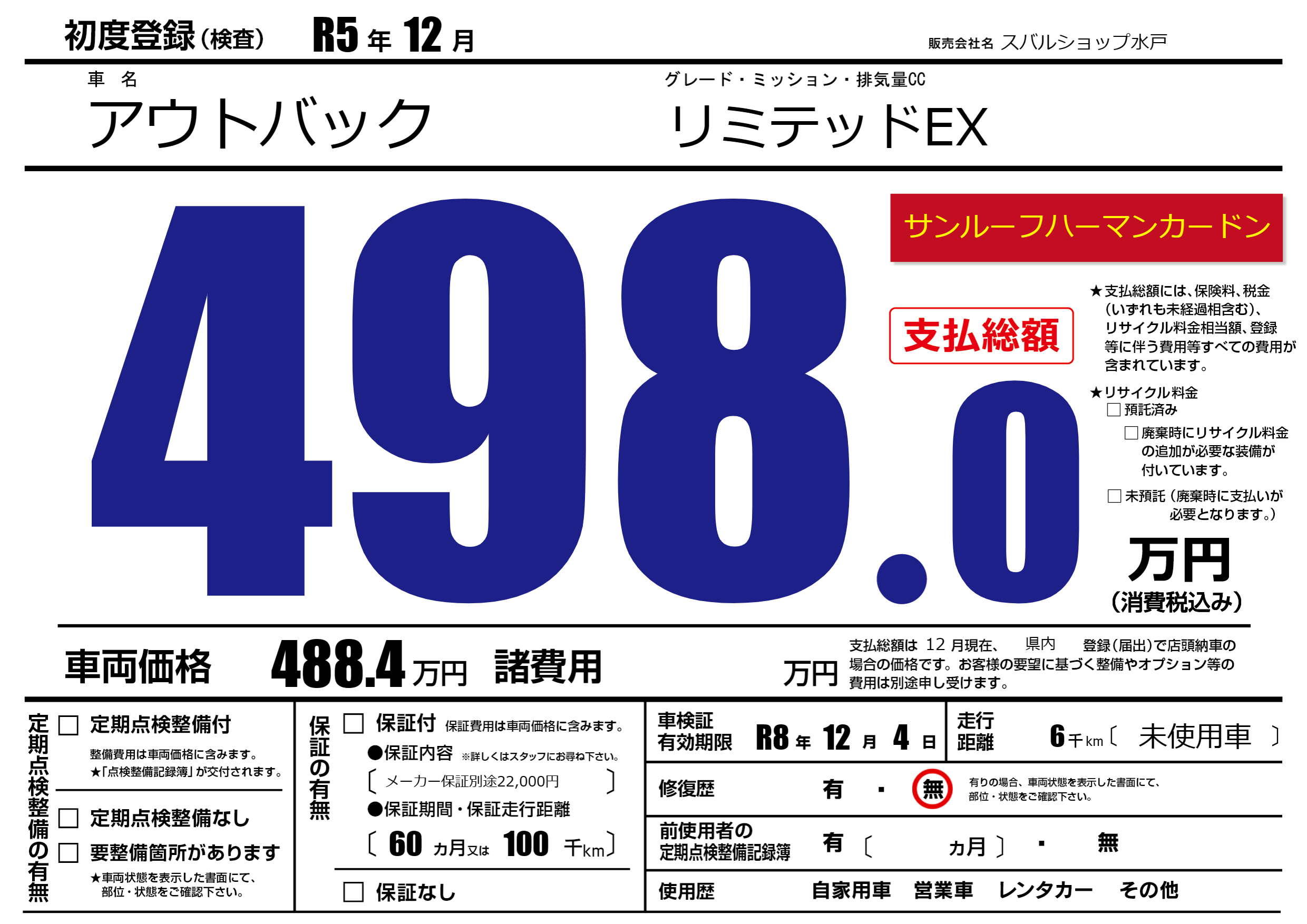 | 車名 | アウトバック | グレード ミッション 排気量 |