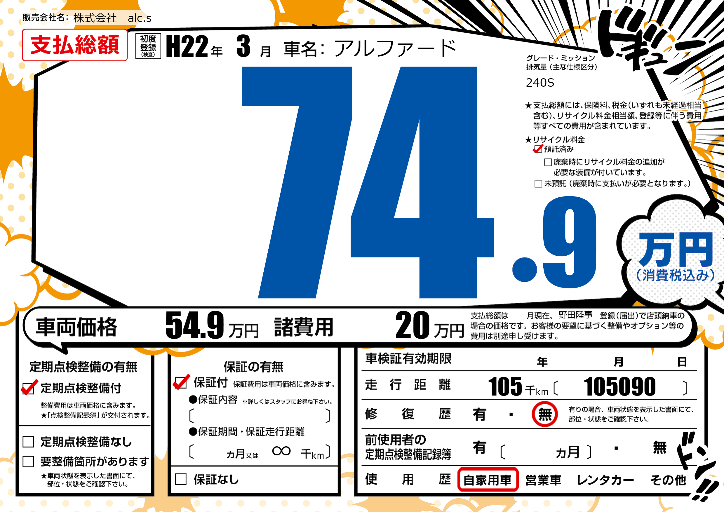 | 走行キロ | 10.5万km | 初年度登録 | H22年3月 |