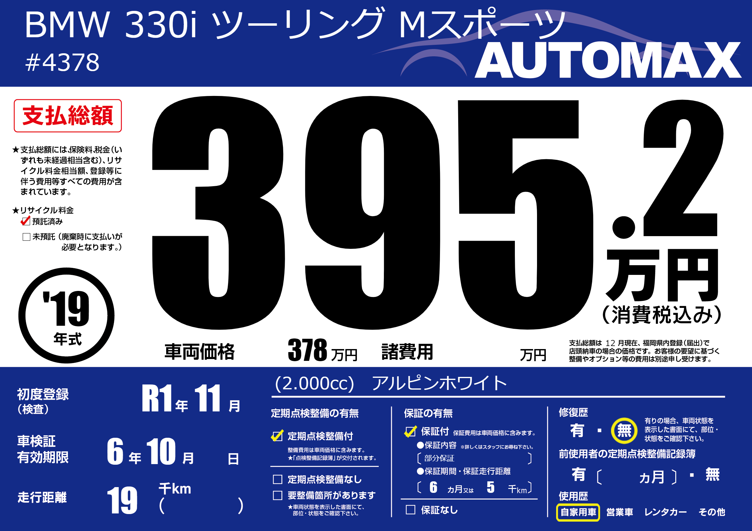 | 車名 | BMW 330i ツーリング Mスポーツ | グレード ミッション 排気量 |