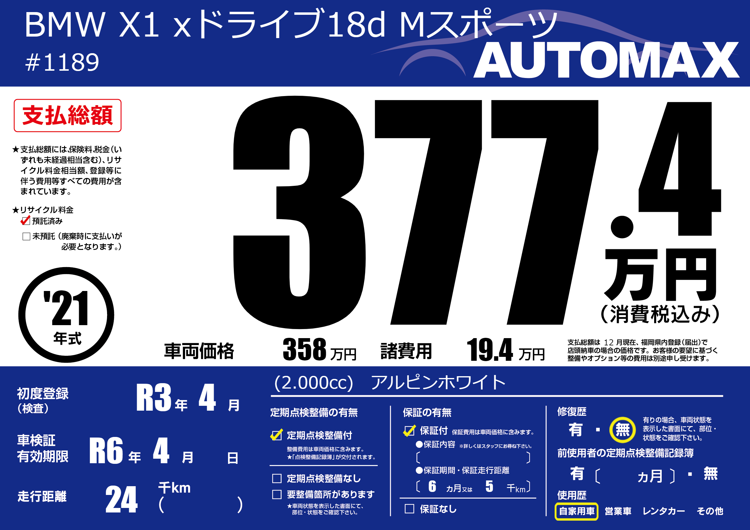 | 車名 | BMW X1 xドライブ18d Mスポーツ | グレード ミッション 排気量 |