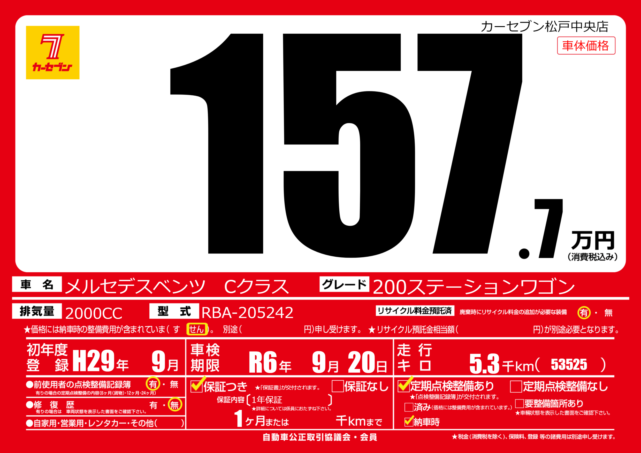 | 車名 | メルセデスベンツ Cクラス | グレード ミッション 排気量 |
