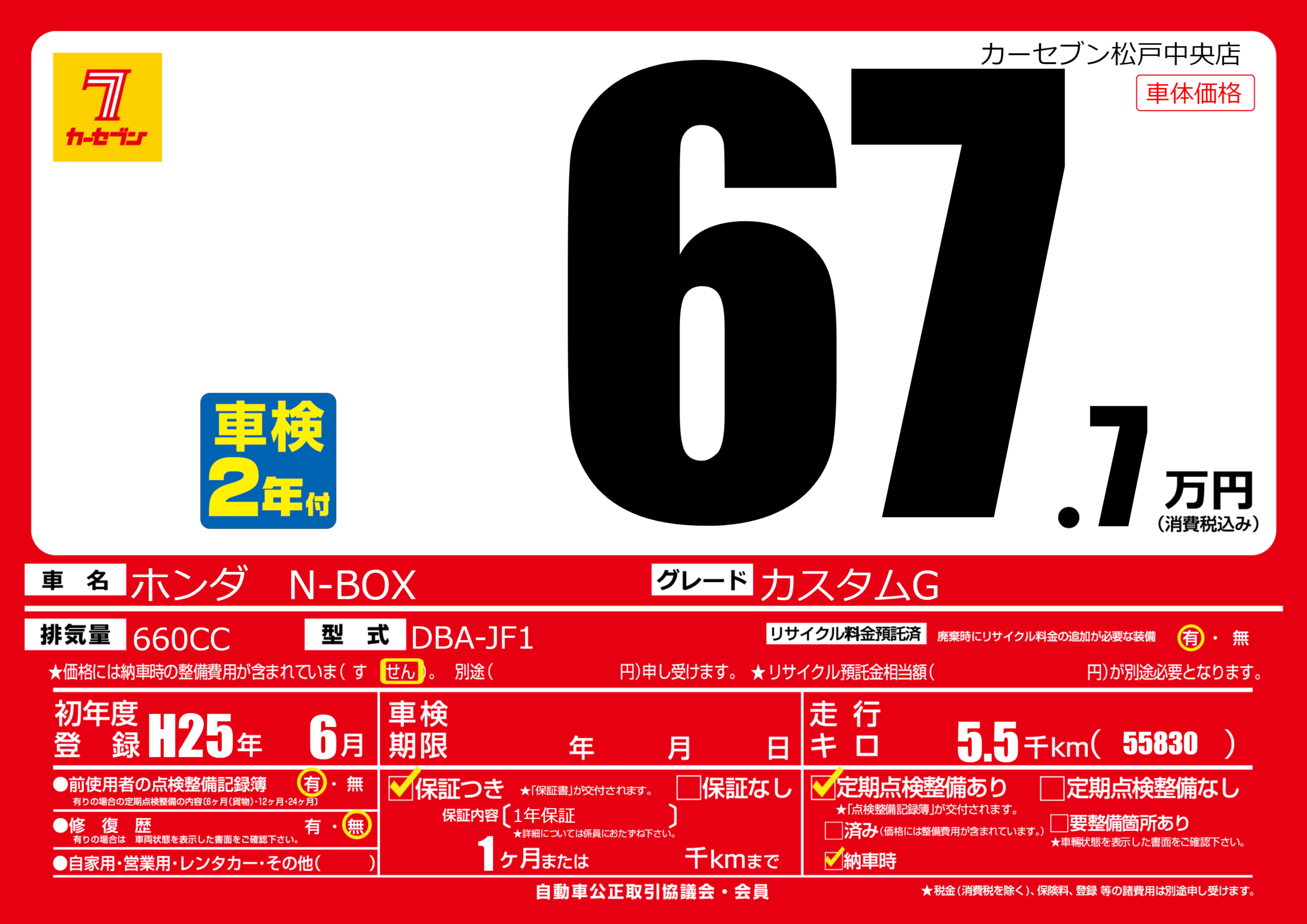 | 走行キロ | 0.5万km | 初年度登録 | H25年6月 |