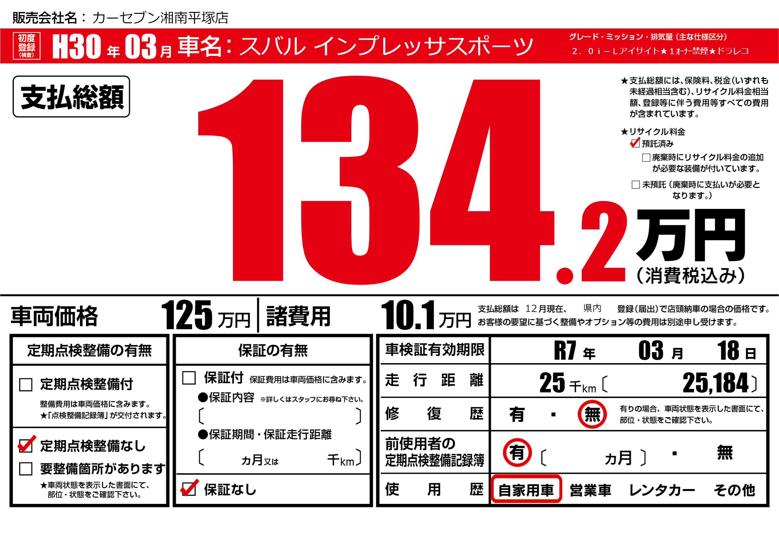 | 車名 | スバル インプレッサスポーツ | グレード ミッション 排気量 |