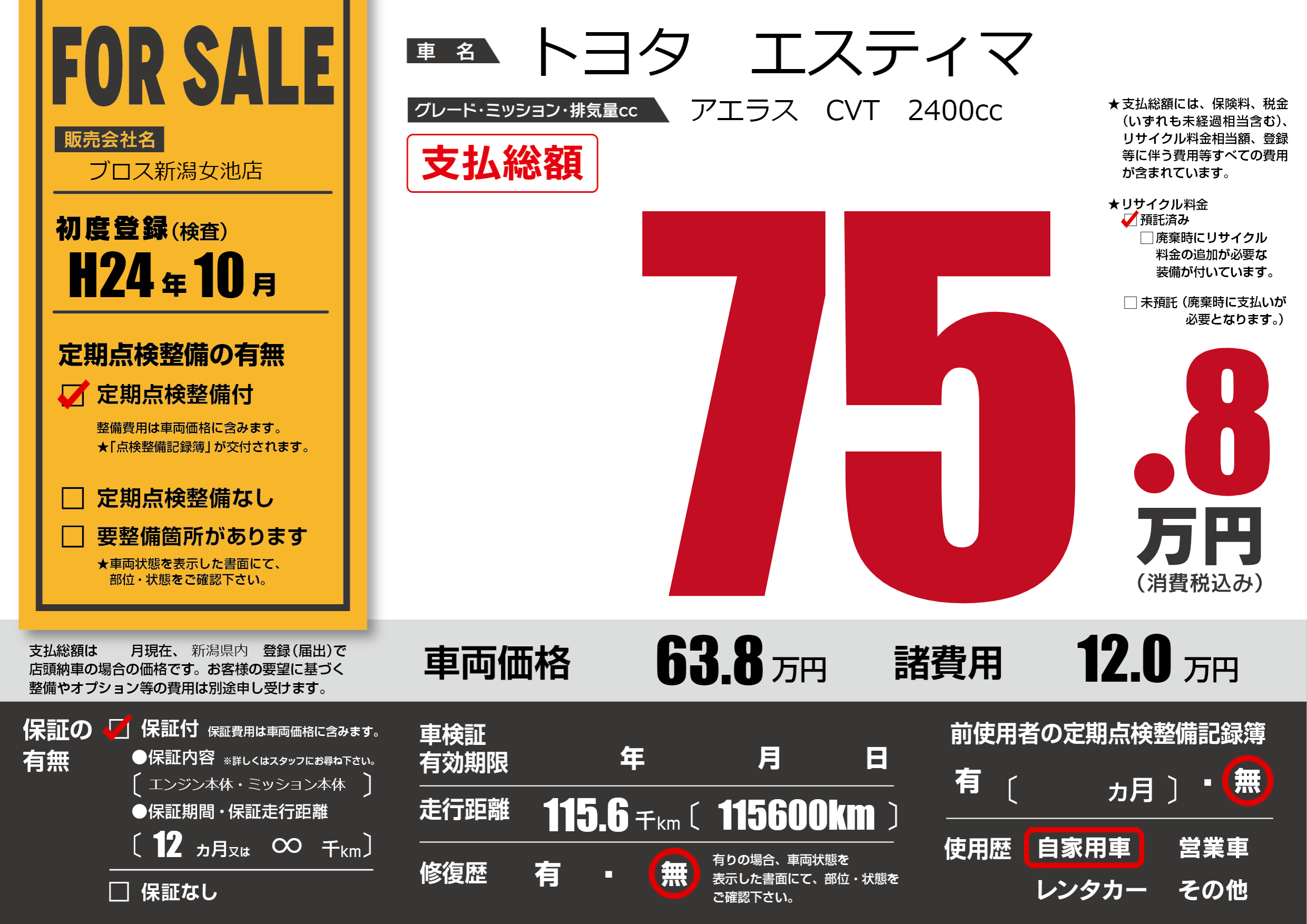 | 車名 | トヨタ エスティマ | グレード ミッション 排気量 |