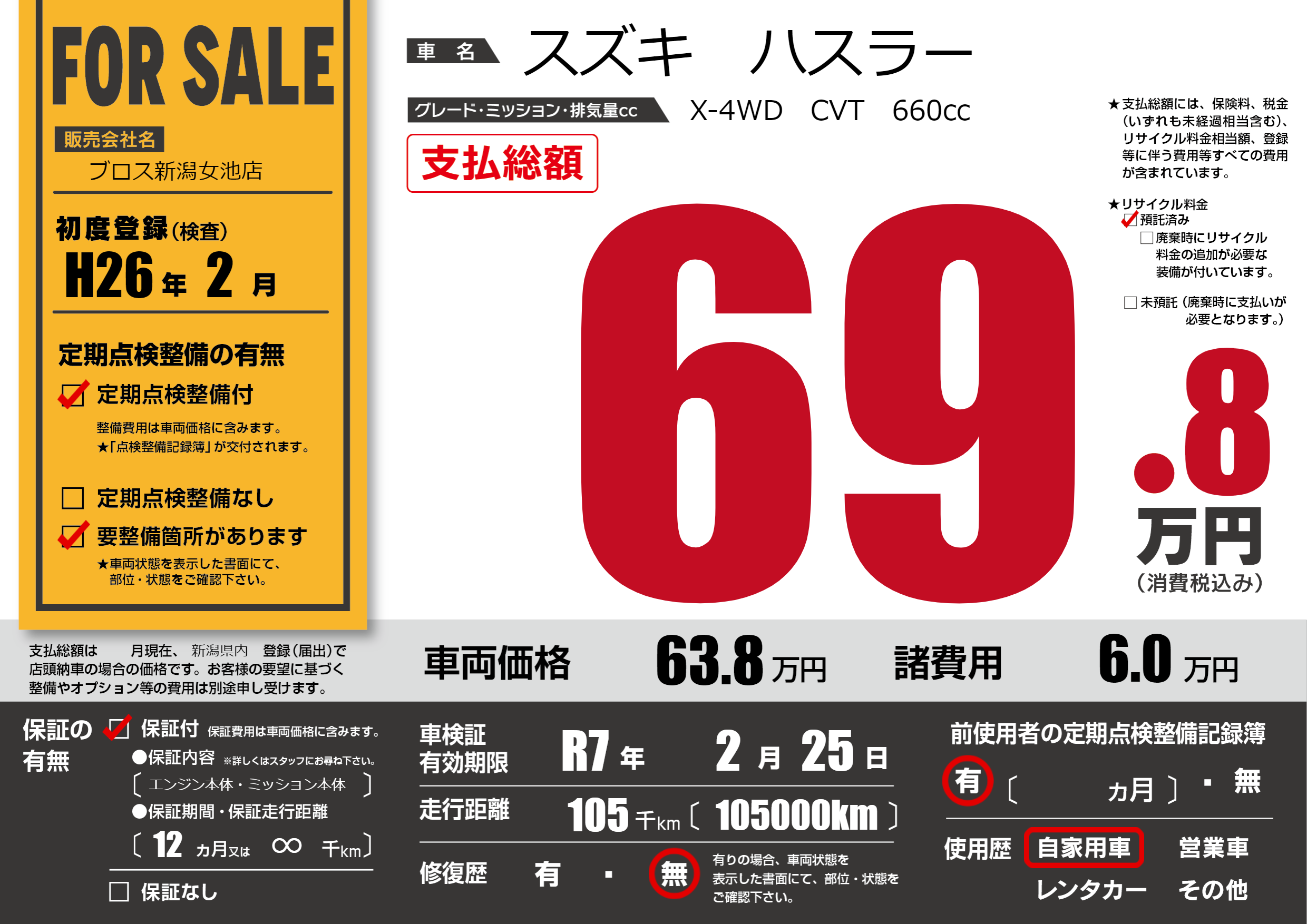 | 車名 | スズキ ハスラー | グレード ミッション 排気量 |