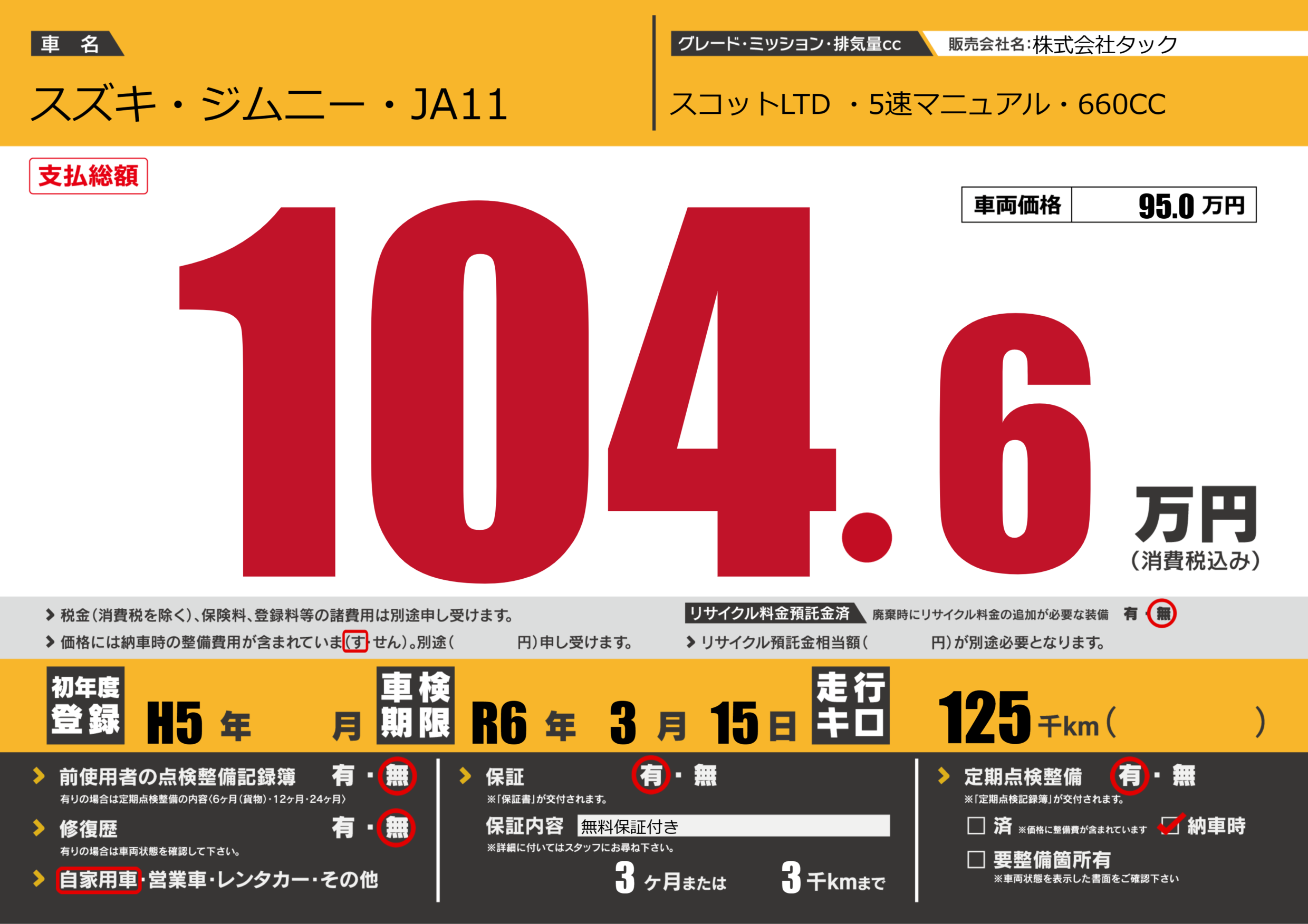 保証なし 保証内容(無料保証付き) 3ヶ月または(3)千kmまで |