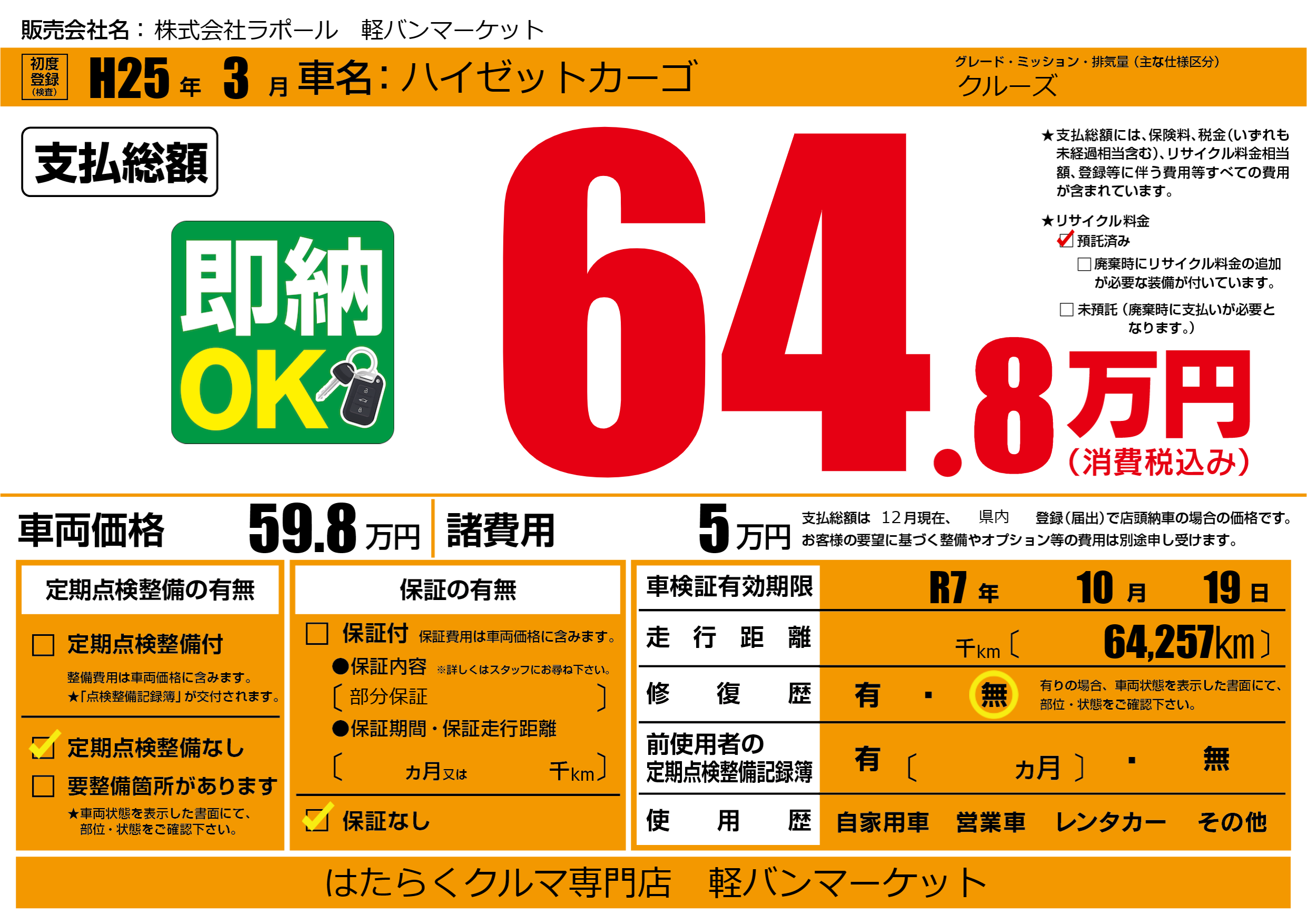 なし | 車検制限 | R7年10月19月 |