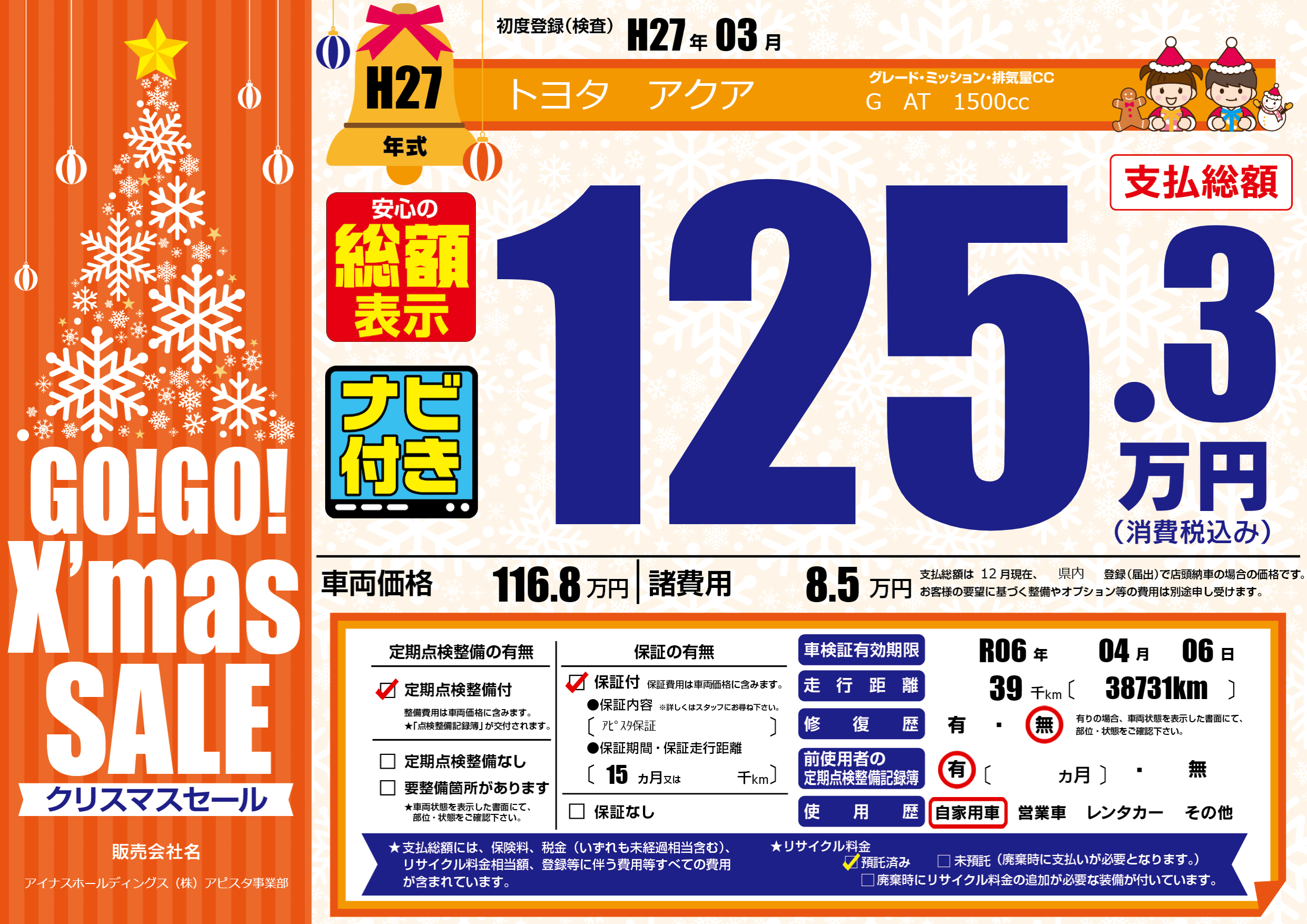 | 走行キロ | 3.9万km | 初年度登録 | H27年03月 |