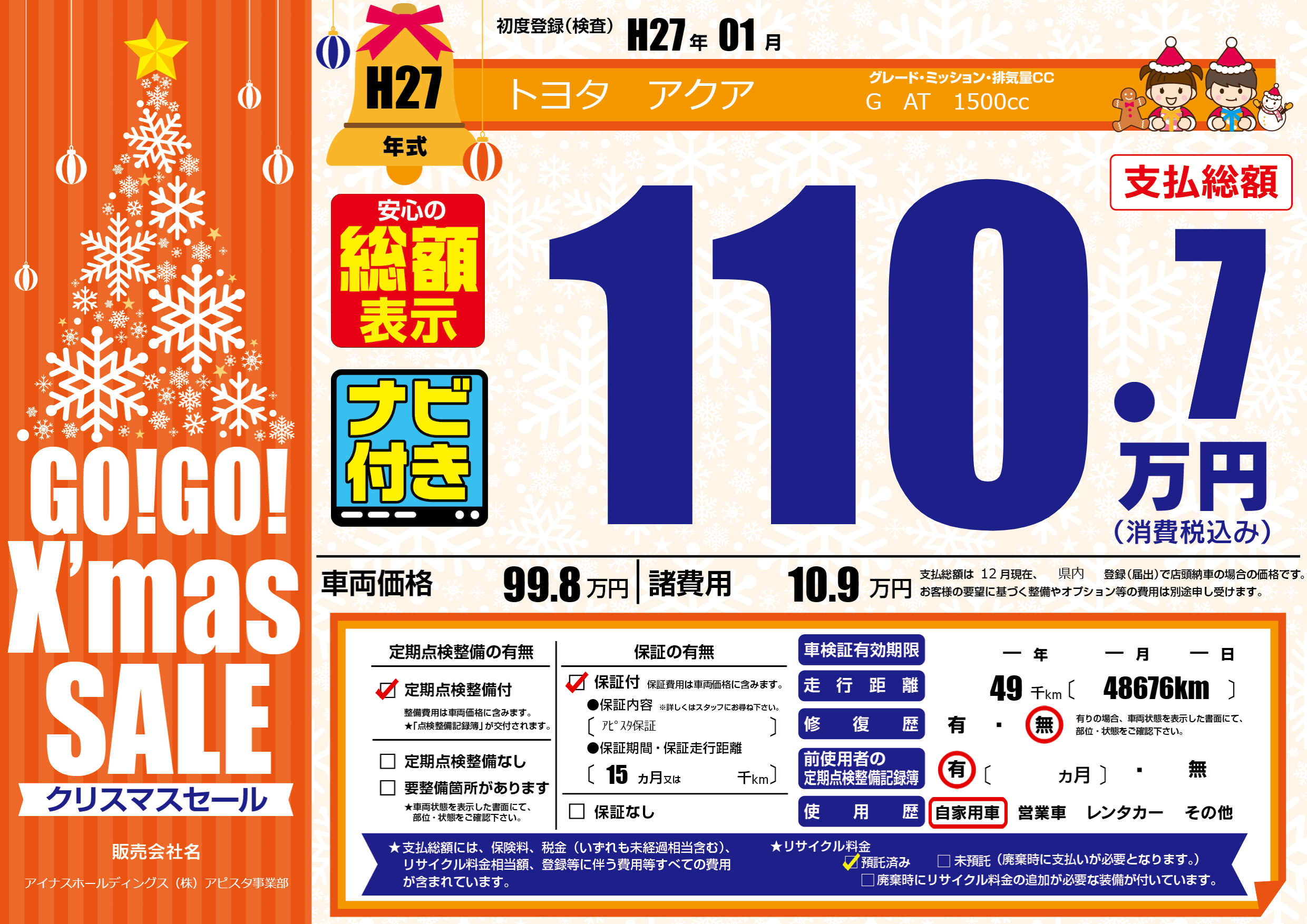 | 車名 | トヨタ アクア | グレード ミッション 排気量 |