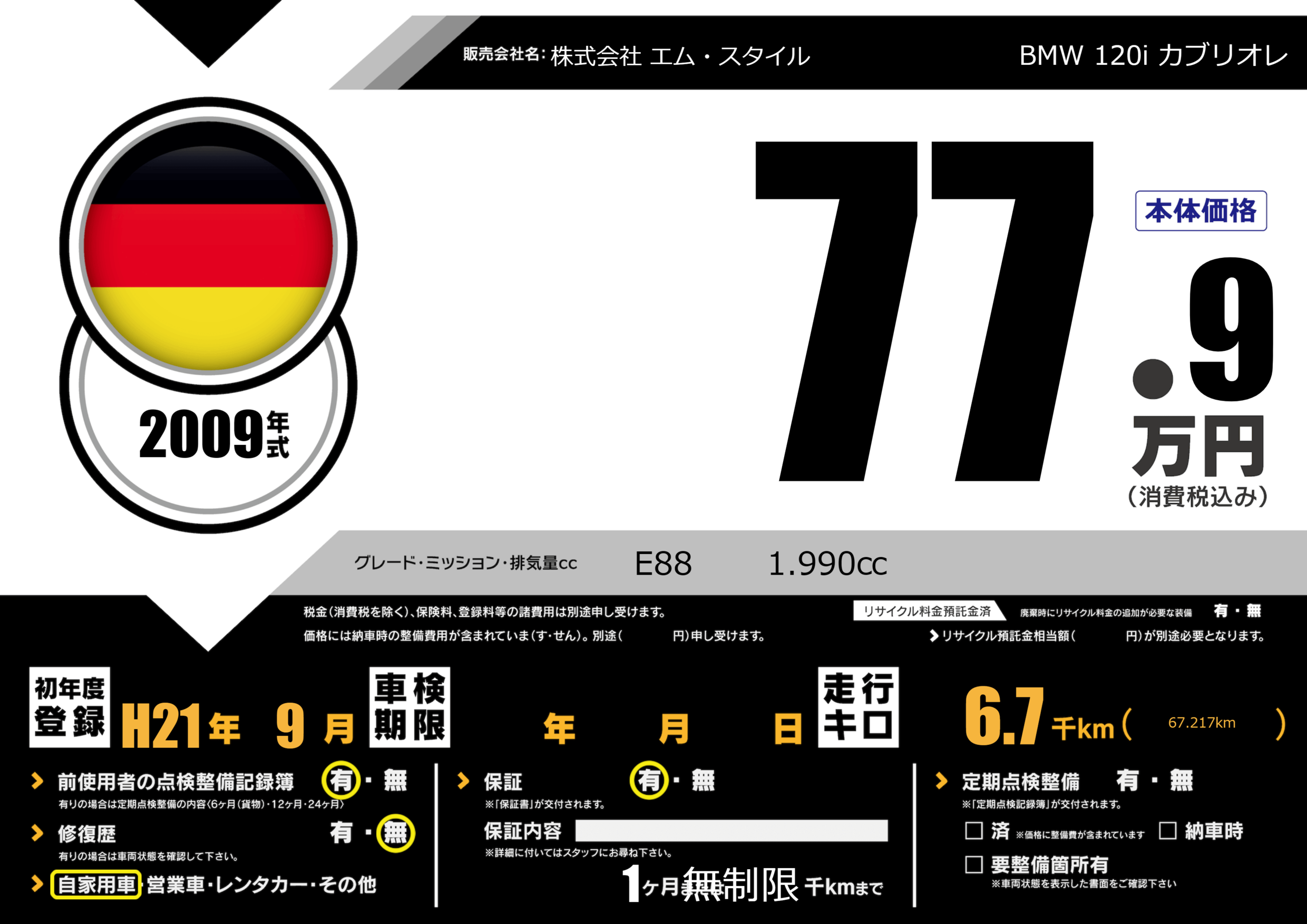 | 車名 | BMW 120i カブリオレ | グレード ミッション 排気量 |