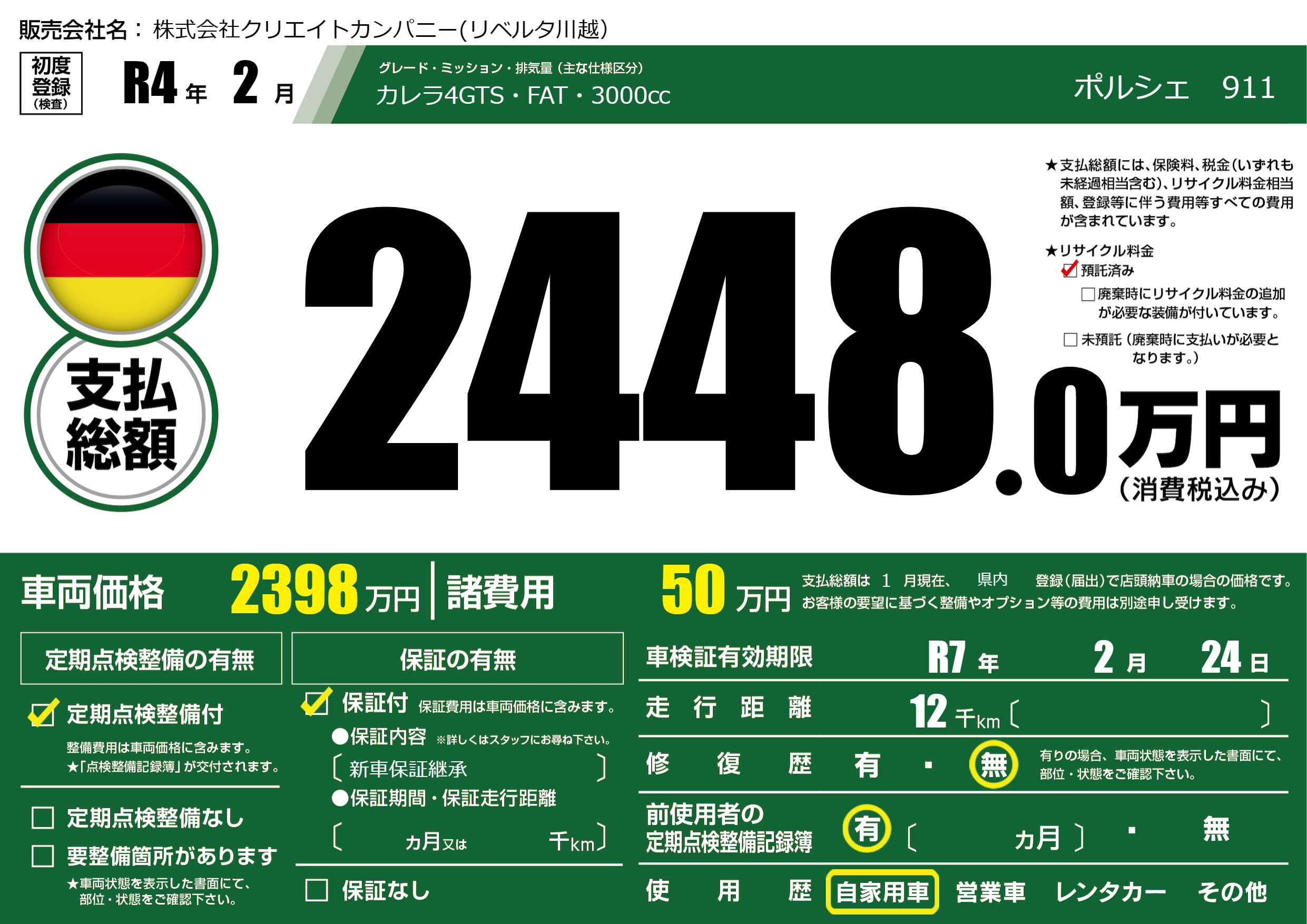| 車名 | ポルシェ 911 | グレード ミッション 排気量 |
