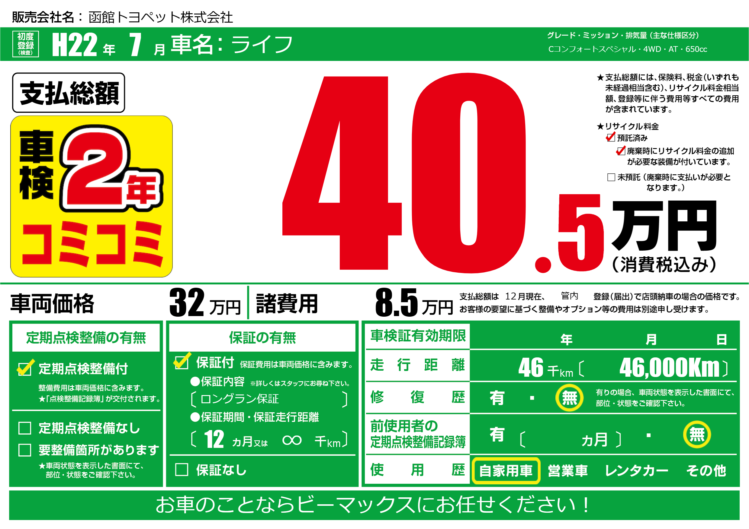 | 車名 | ライフ | グレード ミッション 排気量 |