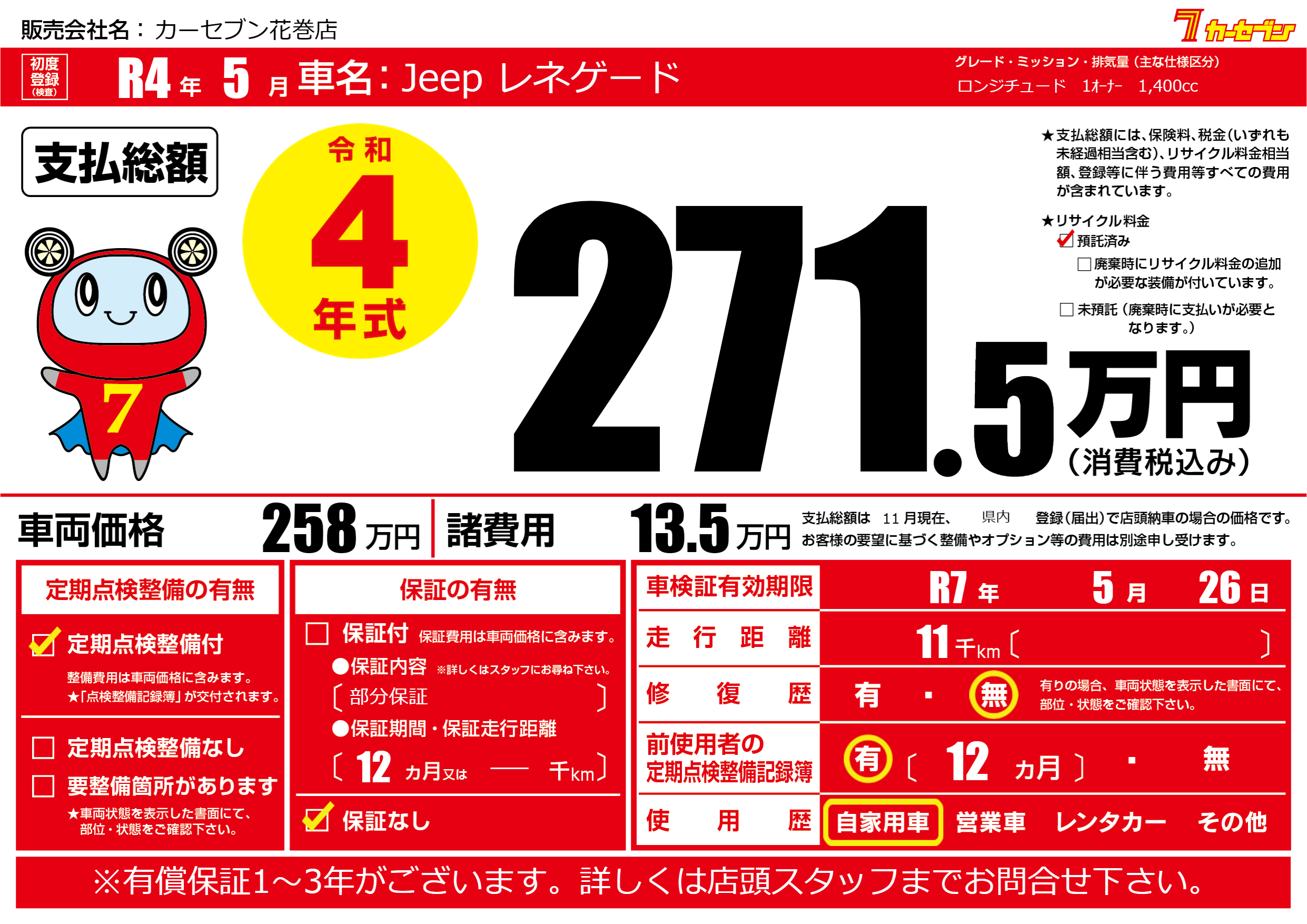 | 走行キロ | 1.1万km | 初年度登録 | R4年5月 |